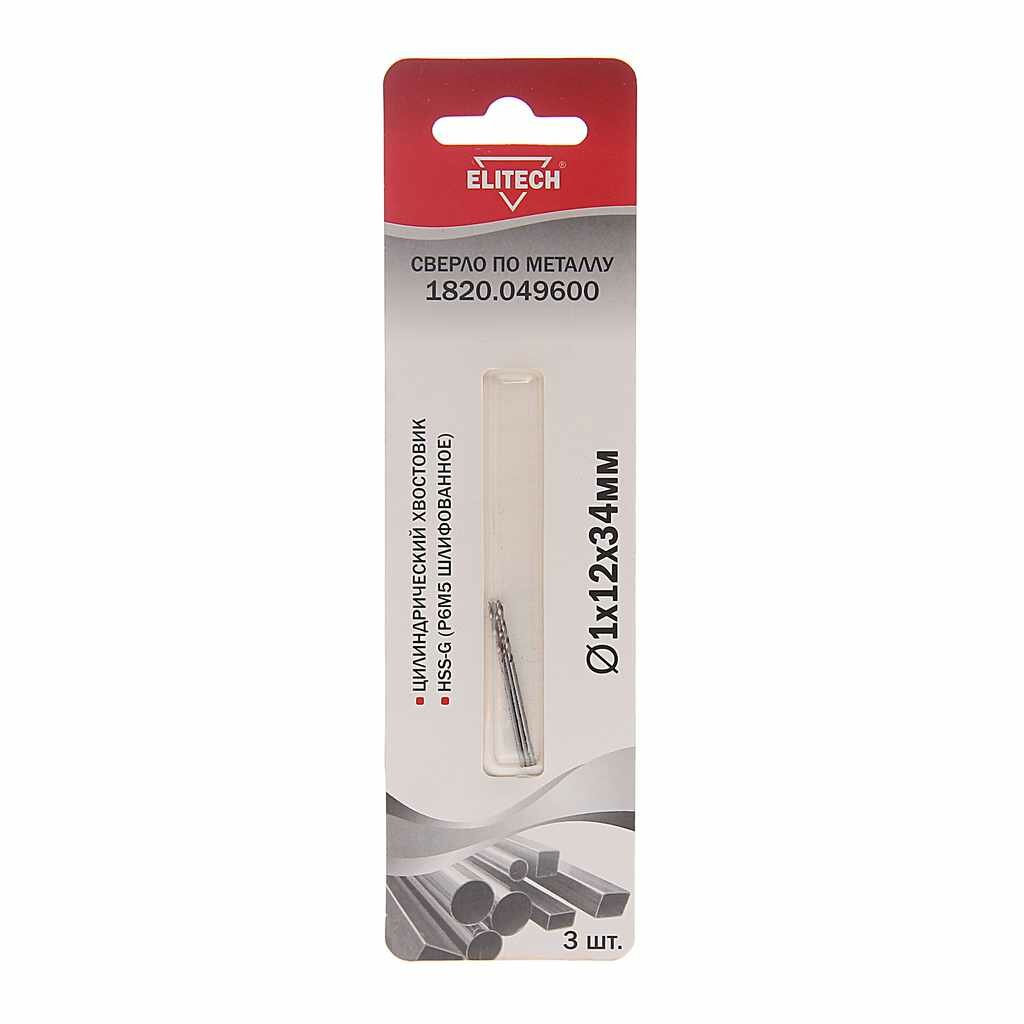 Сверло Elitech 1820.049600 по металлу Д=1мм Дл=34мм (3пред.) для дрелей