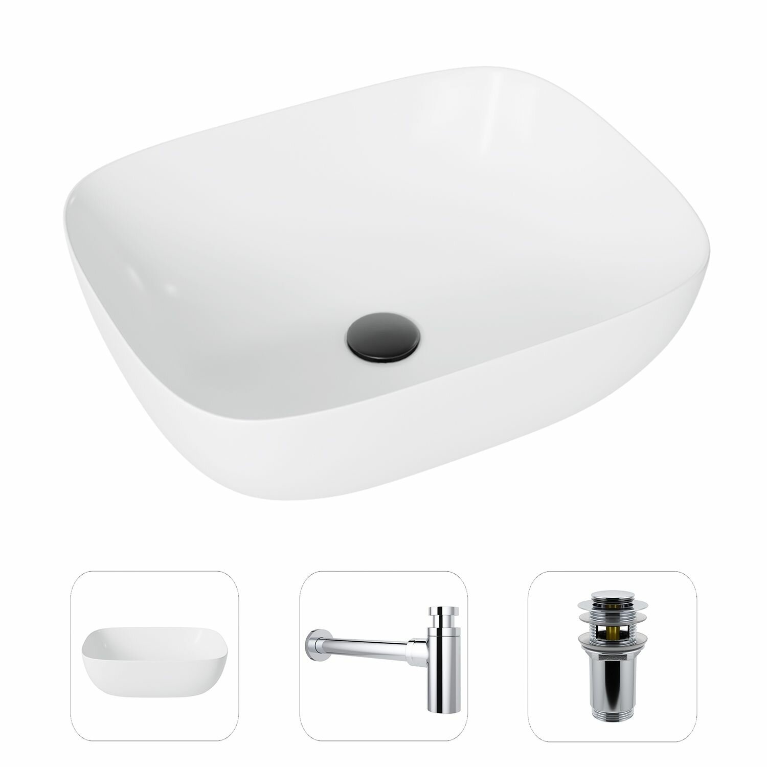Накладная раковина в ванную Helmken 49349000 комплект 3 в 1: умывальник прямоугольный 49,5 см, сифон и донный клапан click-clack в цвете белый