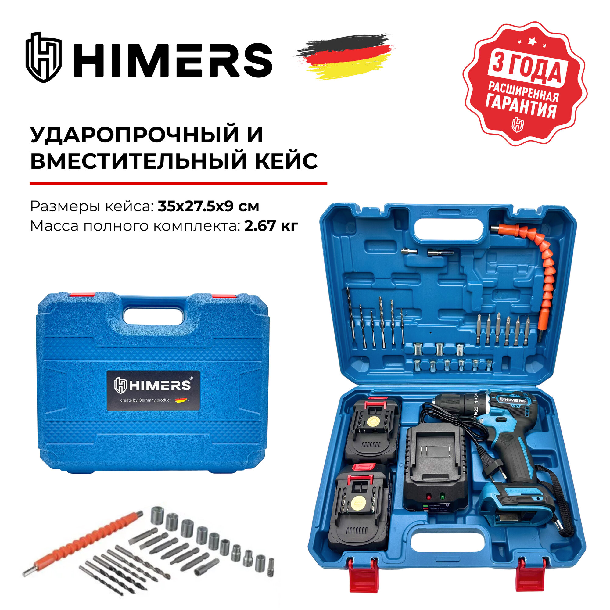 Ударный бесщеточный шуруповерт HIMERS DF70B-BL аккумуляторный 21V, 2 АКБ по 3 А.ч., 65 Н.м., 10мм патрон, Кейс с набором бит, свёрел, головок инструментов 24 предмета / для сверления, долбления, закручивания 21в
