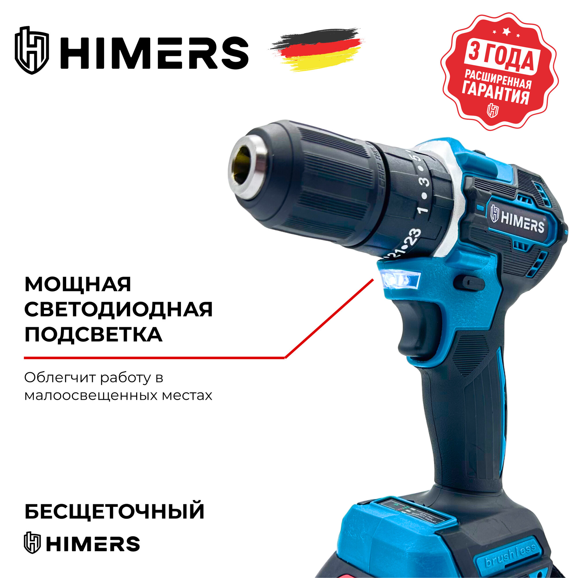 Бесщеточный шуруповерт HIMERS DF60В-BL аккумуляторный 18V, 2 АКБ по 3 А.ч., 60 Н.м., кейс