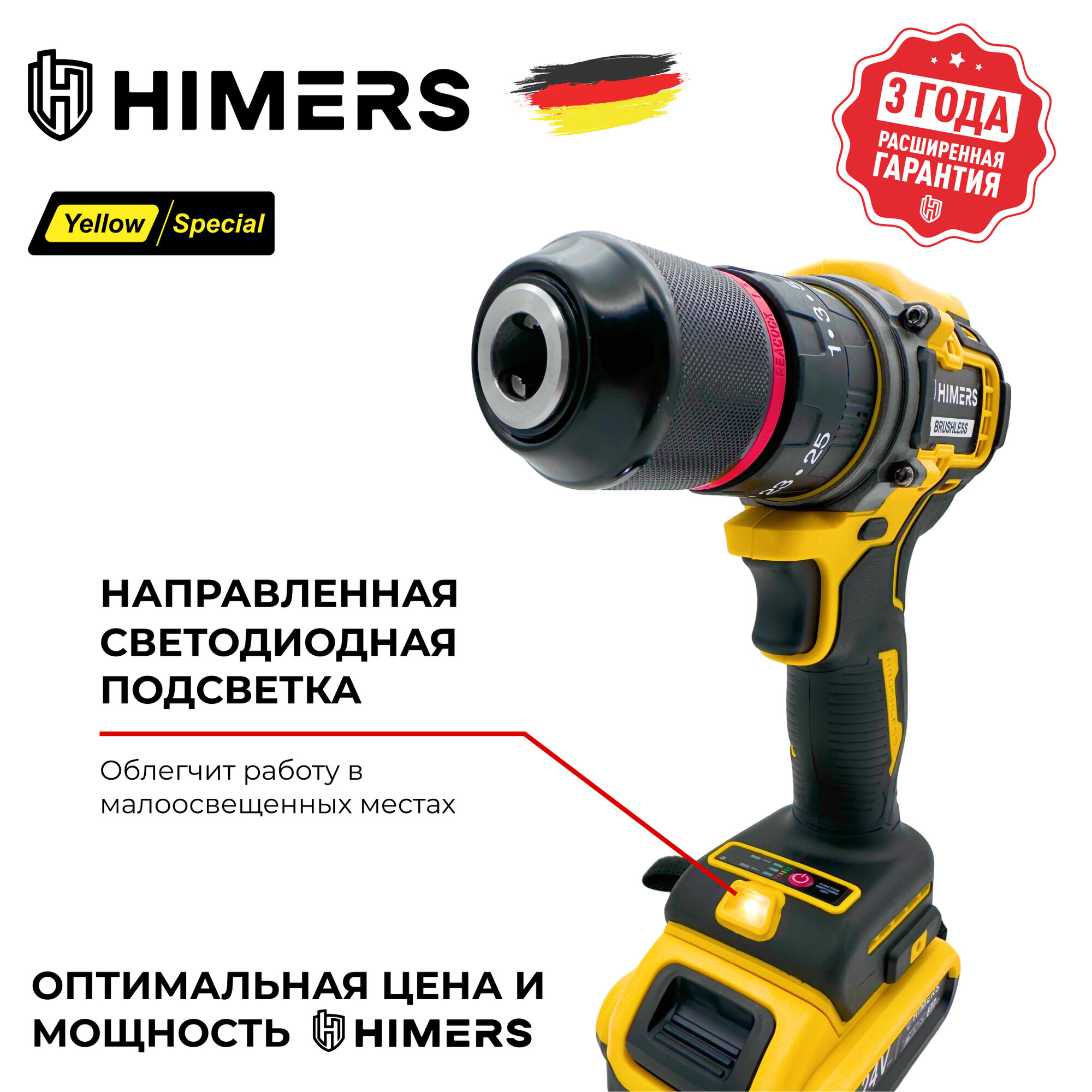 Бесщеточный шуруповерт HIMERS DF65Y-BL аккумуляторный 18V, 2 АКБ по 3 А.ч., 65 Н.м., 10мм патрон, Версия Yellow special / Кейс / многофункциональный для сверления, закручивания 18в
