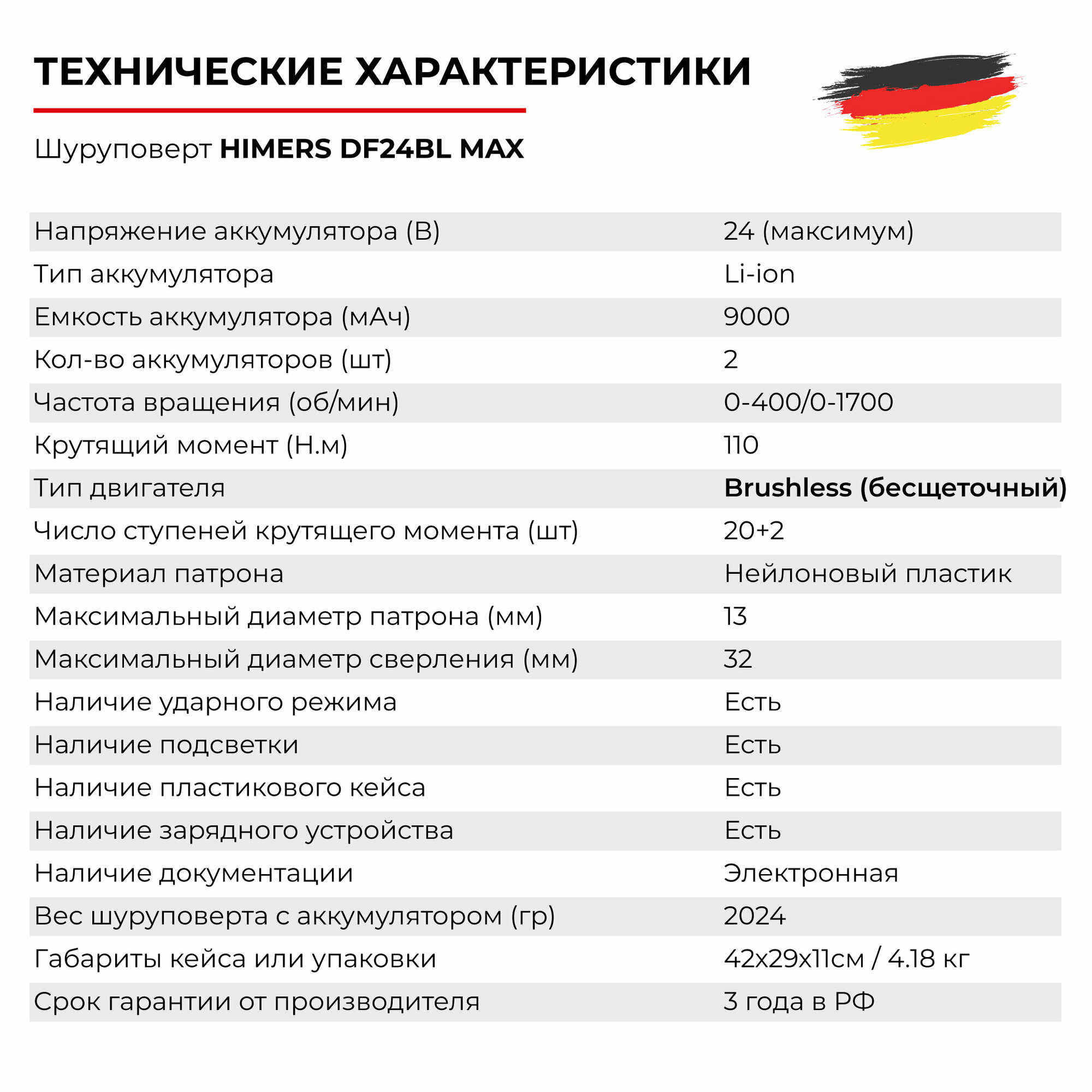 Бесщеточный шуруповерт HIMERS DF24BL аккумуляторный 24V, 2 АКБ по 3 а.ч, 85 Н.м, 13 мм патрон / Кейс с набором бит, свёрел, головок 24 предмета