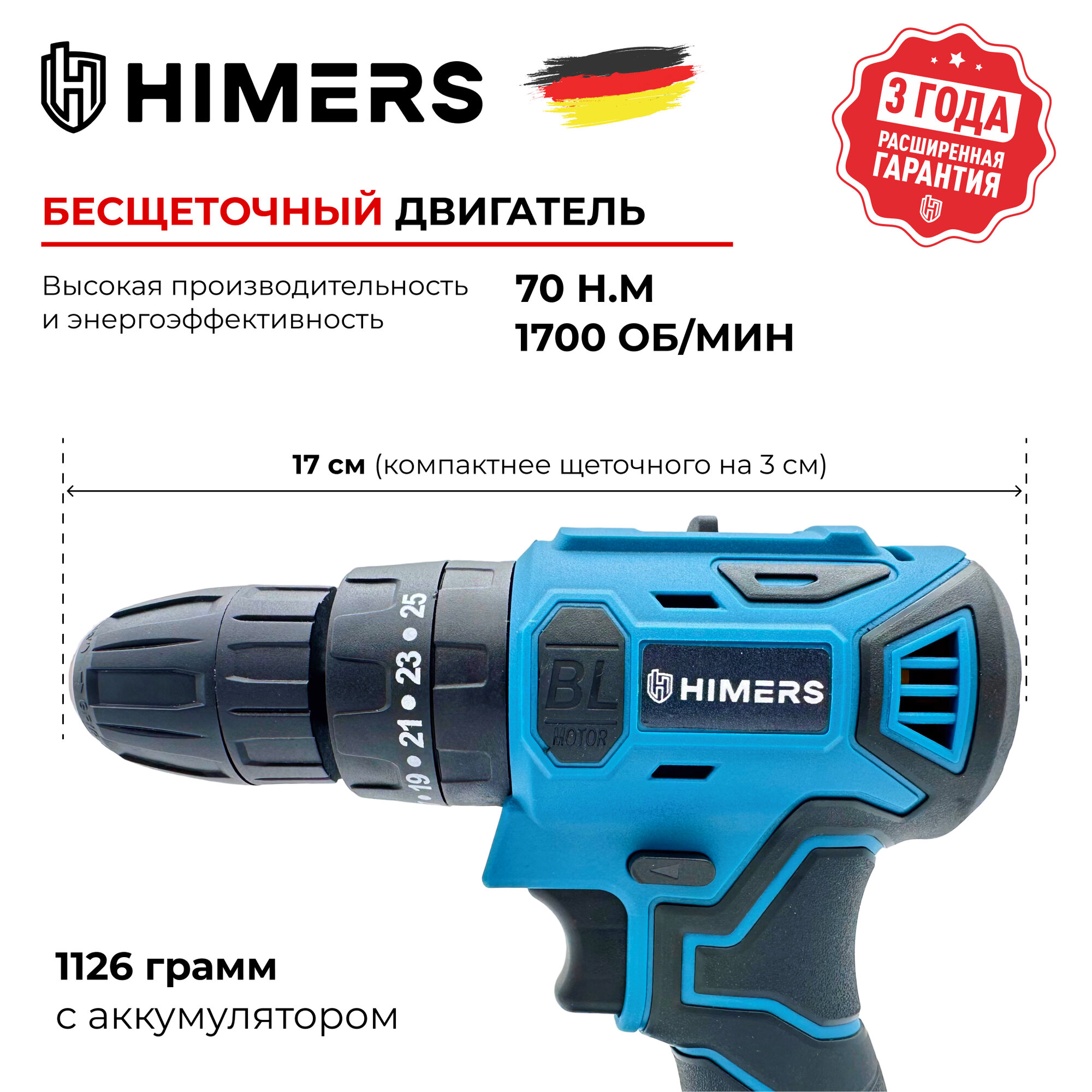 Ударный бесщеточный шуруповерт HIMERS DF70B-BL аккумуляторный 21V, 2 АКБ по 2 А.ч., 65 Н.м., 10мм патрон, Кейс с набором бит, свёрел, головок инструментов 24 предмета / для сверления, долбления, закручивания 21в