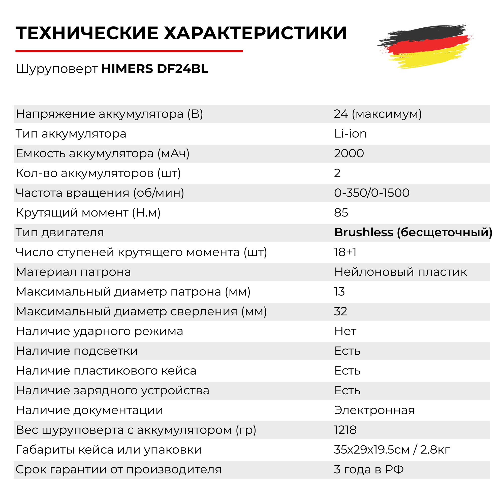 Бесщеточный шуруповерт HIMERS DF24BL аккумуляторный 24V, 2 АКБ по 3 а.ч, 85 Н.м, 13 мм патрон / Кейс с набором бит, свёрел, головок 24 предмета