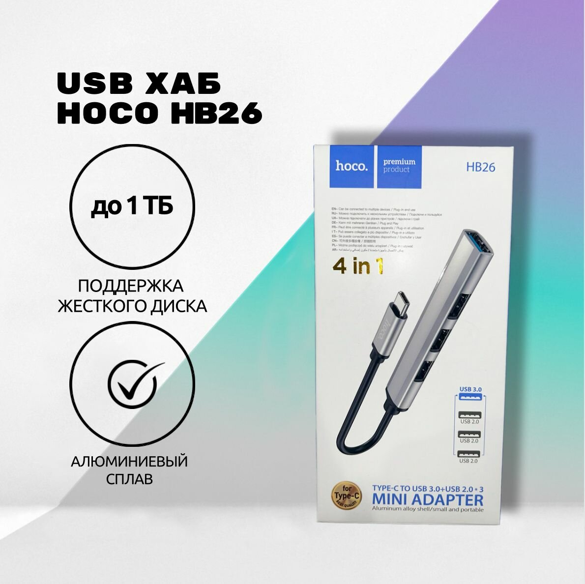 Ниже Вы можете прочитать отзывы на Хаб HUB Type-C на 4USB HB26 HOCO серебро, ознакомится с подробными характеристиками, посмотреть интересные обзоры и фотографии на Хаб HUB Type-C на 4USB HB26 HOCO серебро.