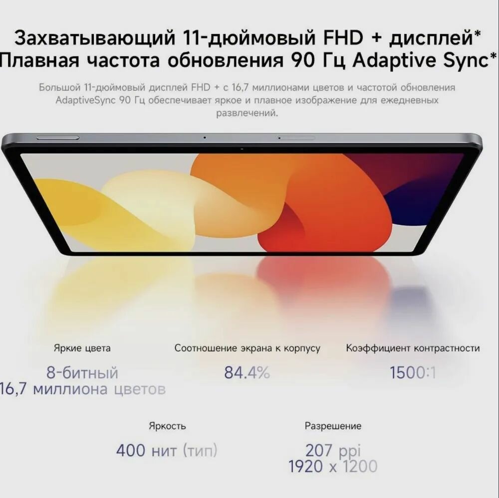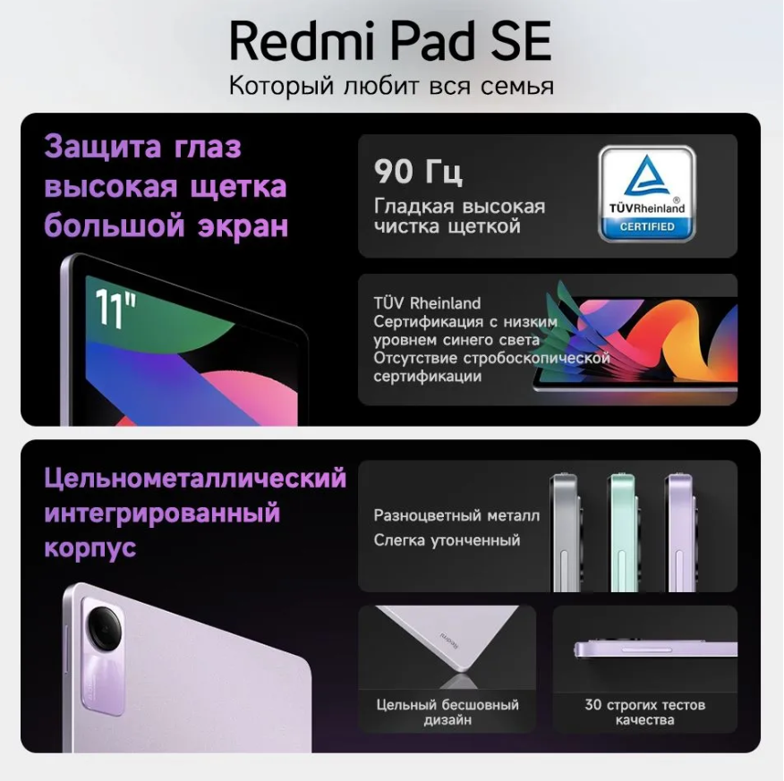 | Комплектация | Redmi Pad SE, адаптер питания, USB-кабель, гарантийный талон, руководство пользователя |