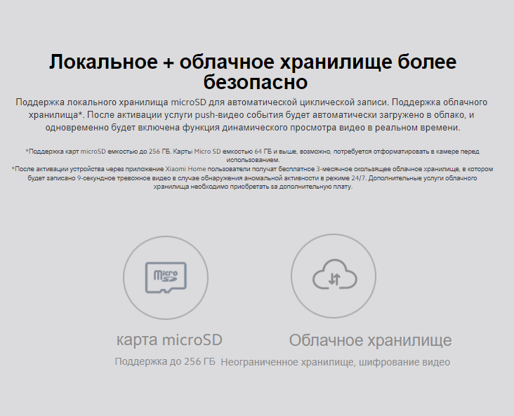 | Дополнительная информация | комплектация: IP-камера, кабель питания, комплект аксессуаров для настенного монтажа, руководство пользователя; три метода хранения: локальная карта Micro SD, устройства NAS и облако; карты памяти: MicroSD (до 256 Гб); слот для карты памяти: отдельный; управление со смартфона через приложение Mi Home; совместимые ОС: iOS 12, Android 8.0 и выше; апертура: F2.1; Wi-Fi (802.11): g, n, b |
