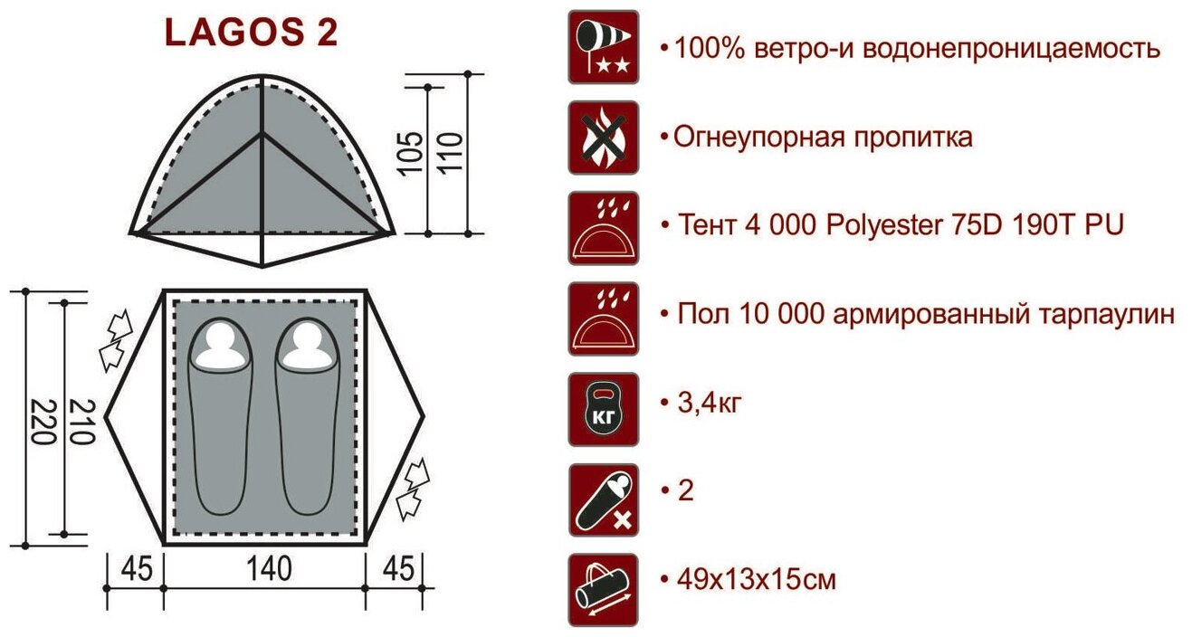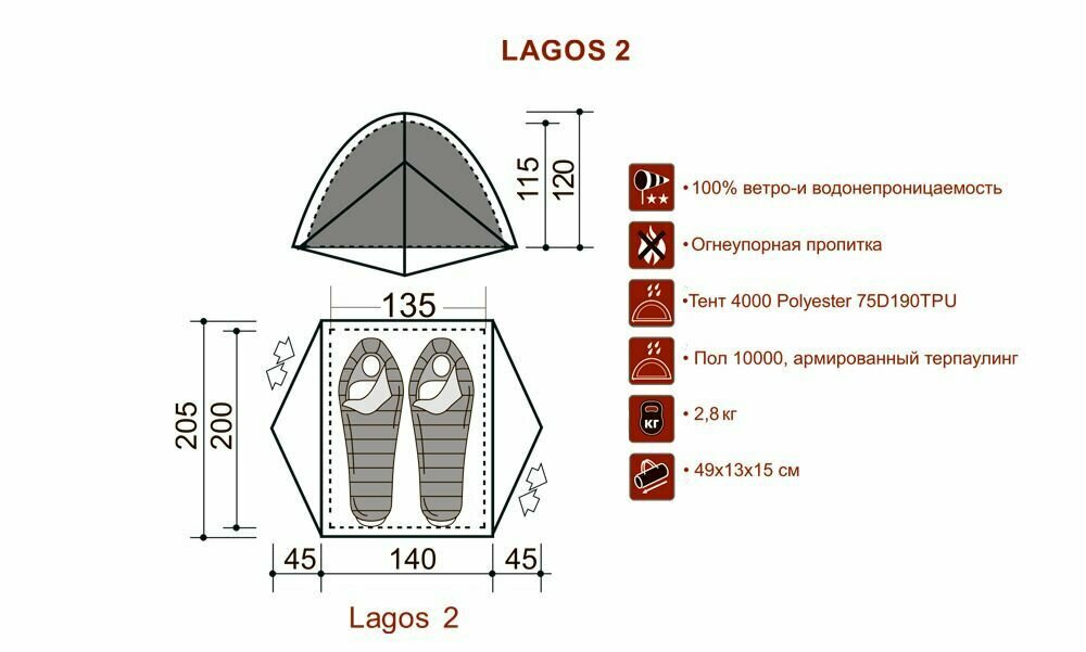 | Особенности | вентиляционные отверстия / внутренняя палатка / Герметизация швов / крепление для фонарика / Полная защита от влаги / противомоскитная сетка / тамбур / штормовые оттяжки |