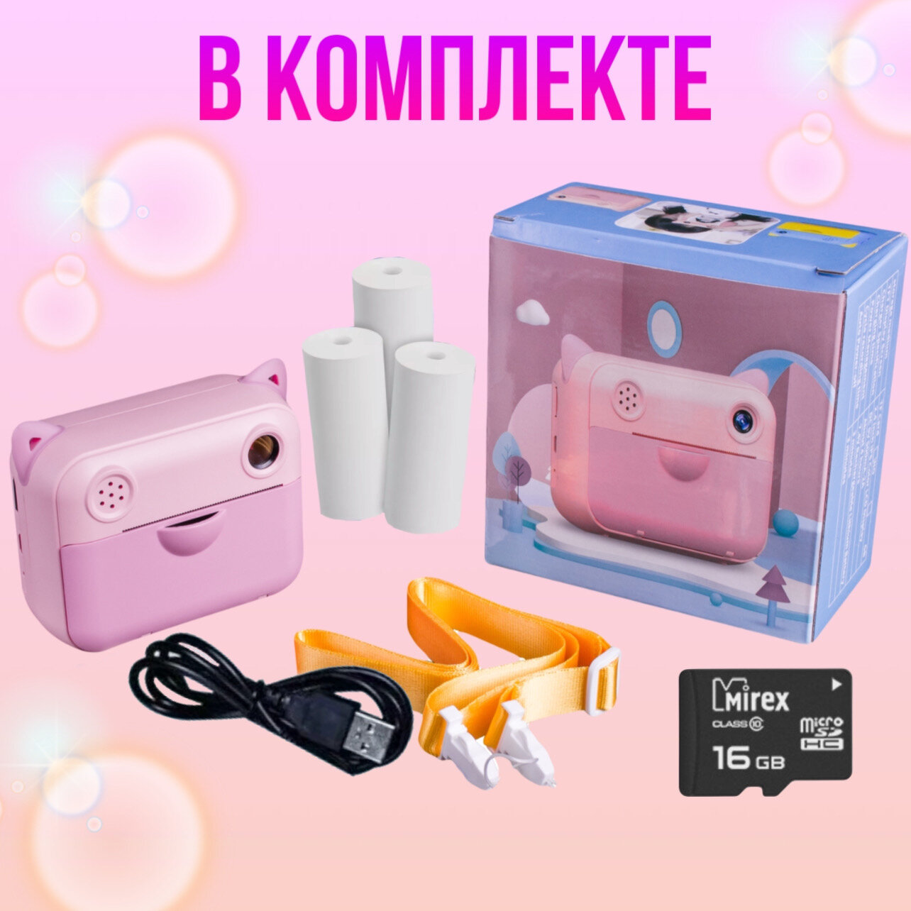 | Комплектация | детский фотоаппарат, зарядный кабель, 3 рулона бумаги, карта памяти на 16 Гб, ремешок на шею |