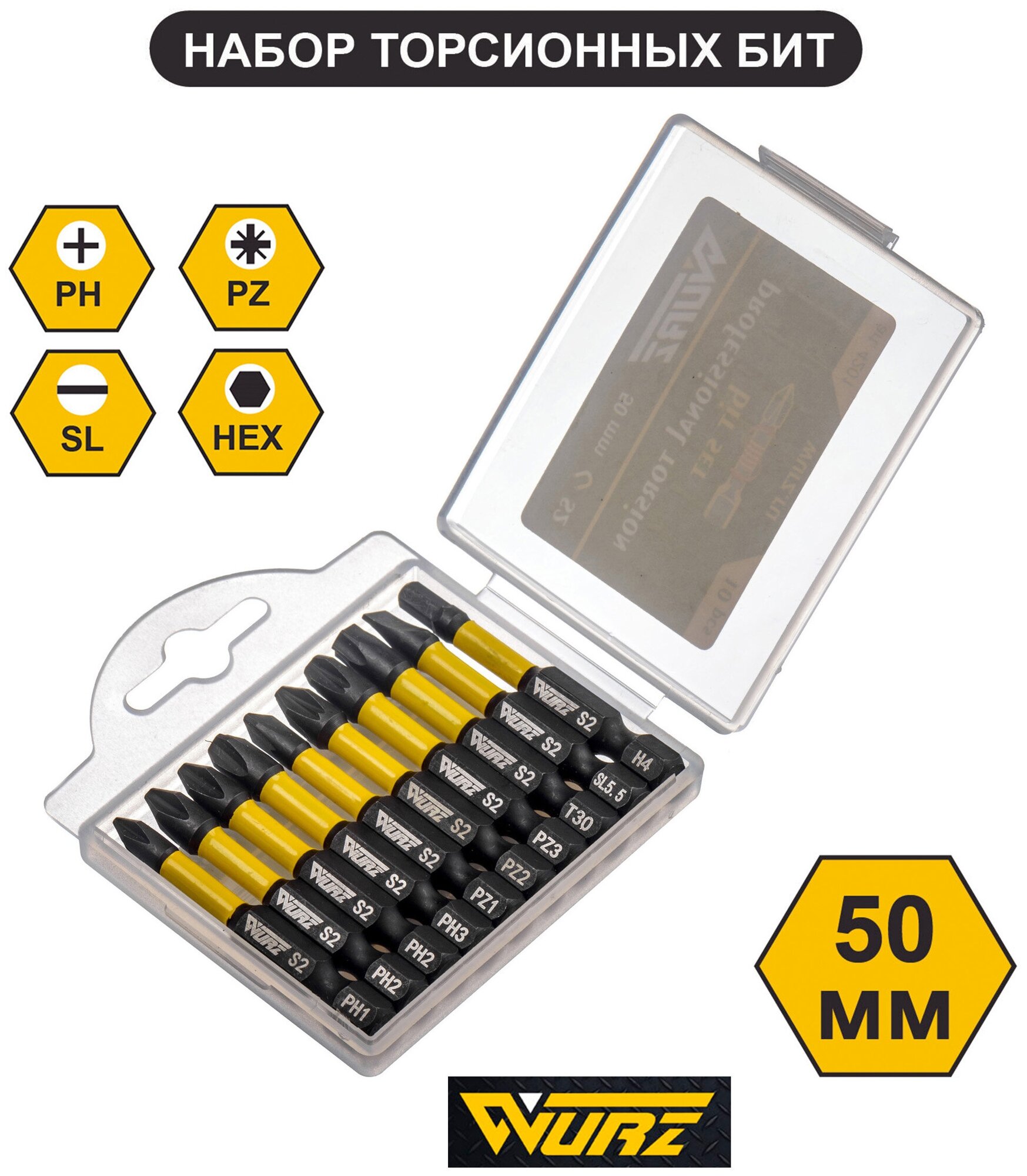 WURZ Набор торсионных бит 50мм (PH, PZ, SL, Hex, Torx) 10шт.