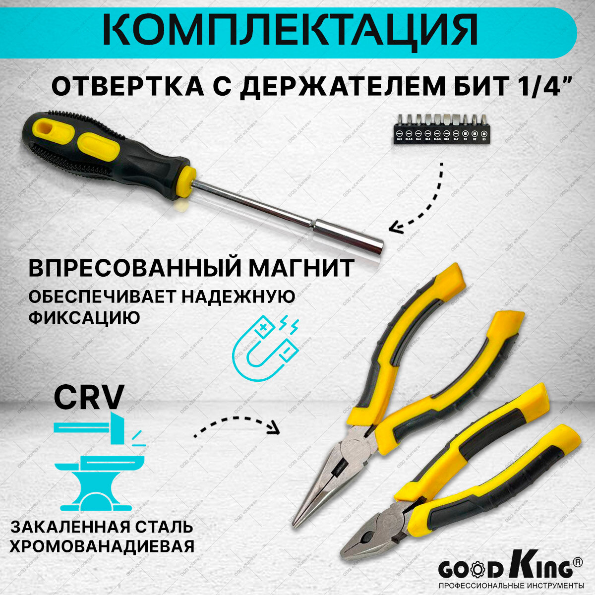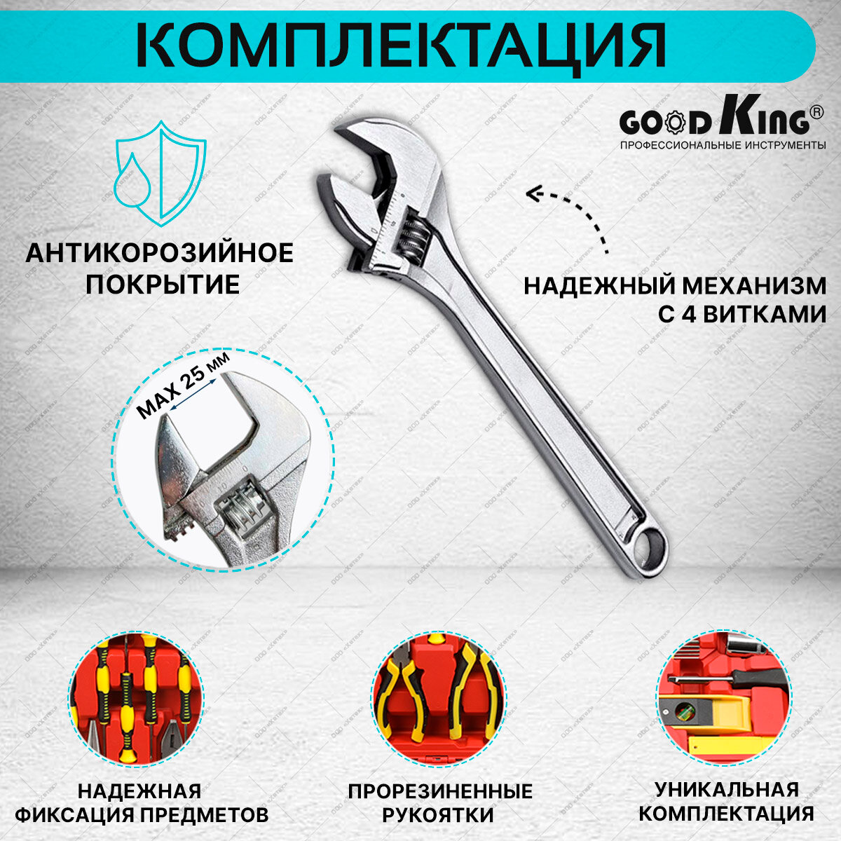 СохранитьНабор инструментов, tools для дома, для автомобиля, GOODKING D-10063 шестигранные ключи, отвертки, комбинированные ключи, трещотка, торцевые головки, кейс интересное: