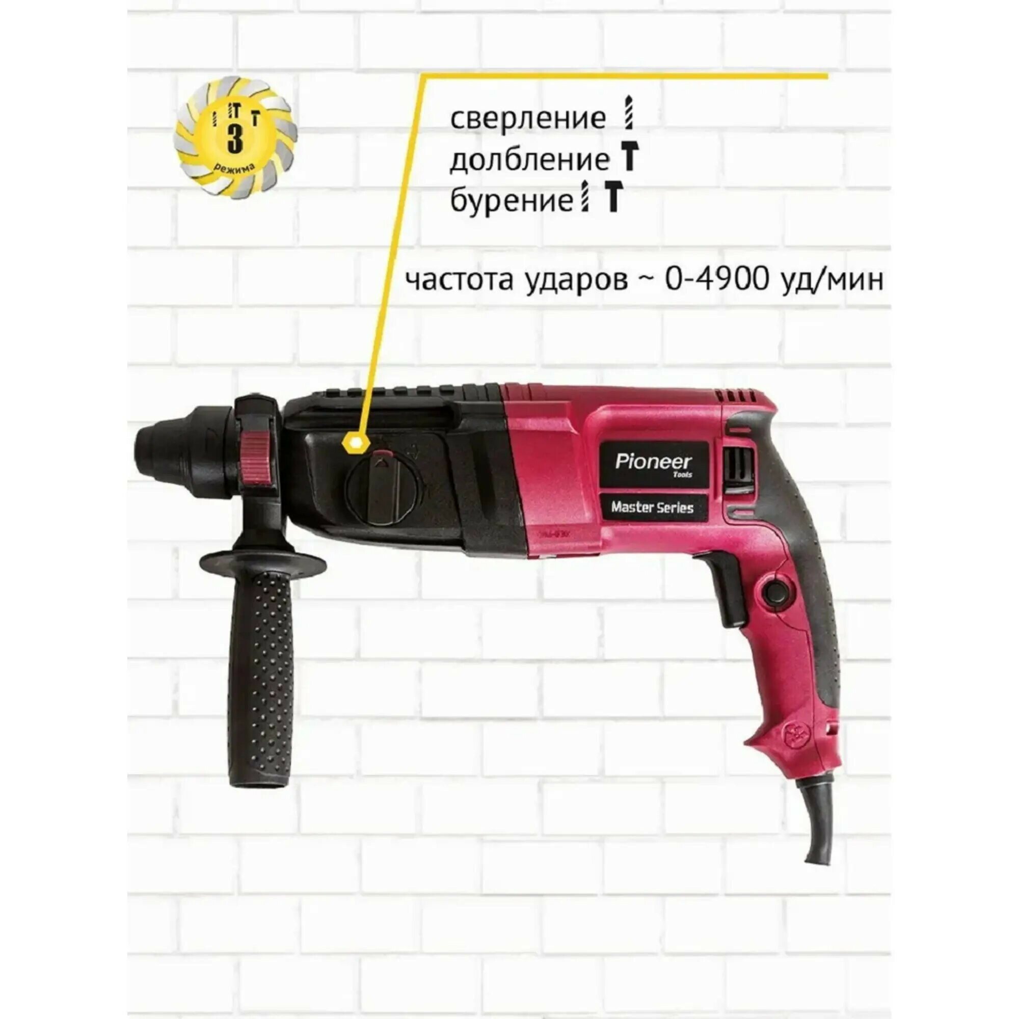 Перфоратор сетевой Pioneer с быстрозажимным патроном, 3 режима работы, реверс, SDS Plus, 3 бура 6/8/10мм, 650 Вт