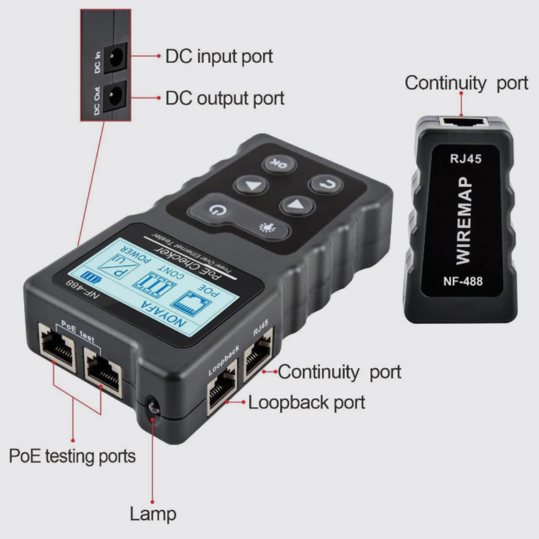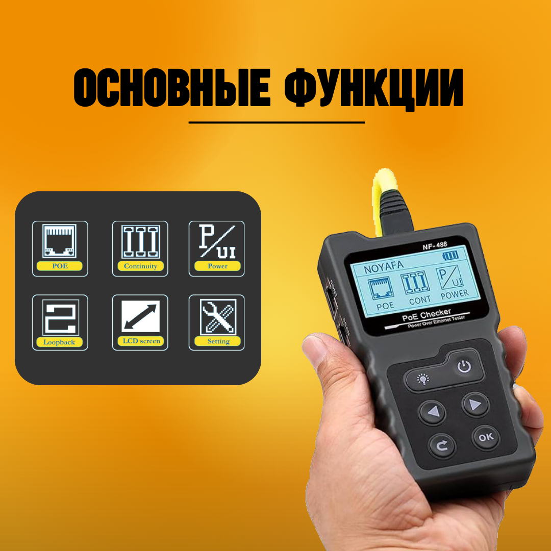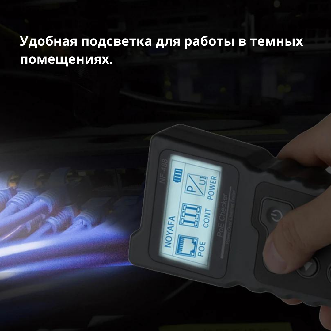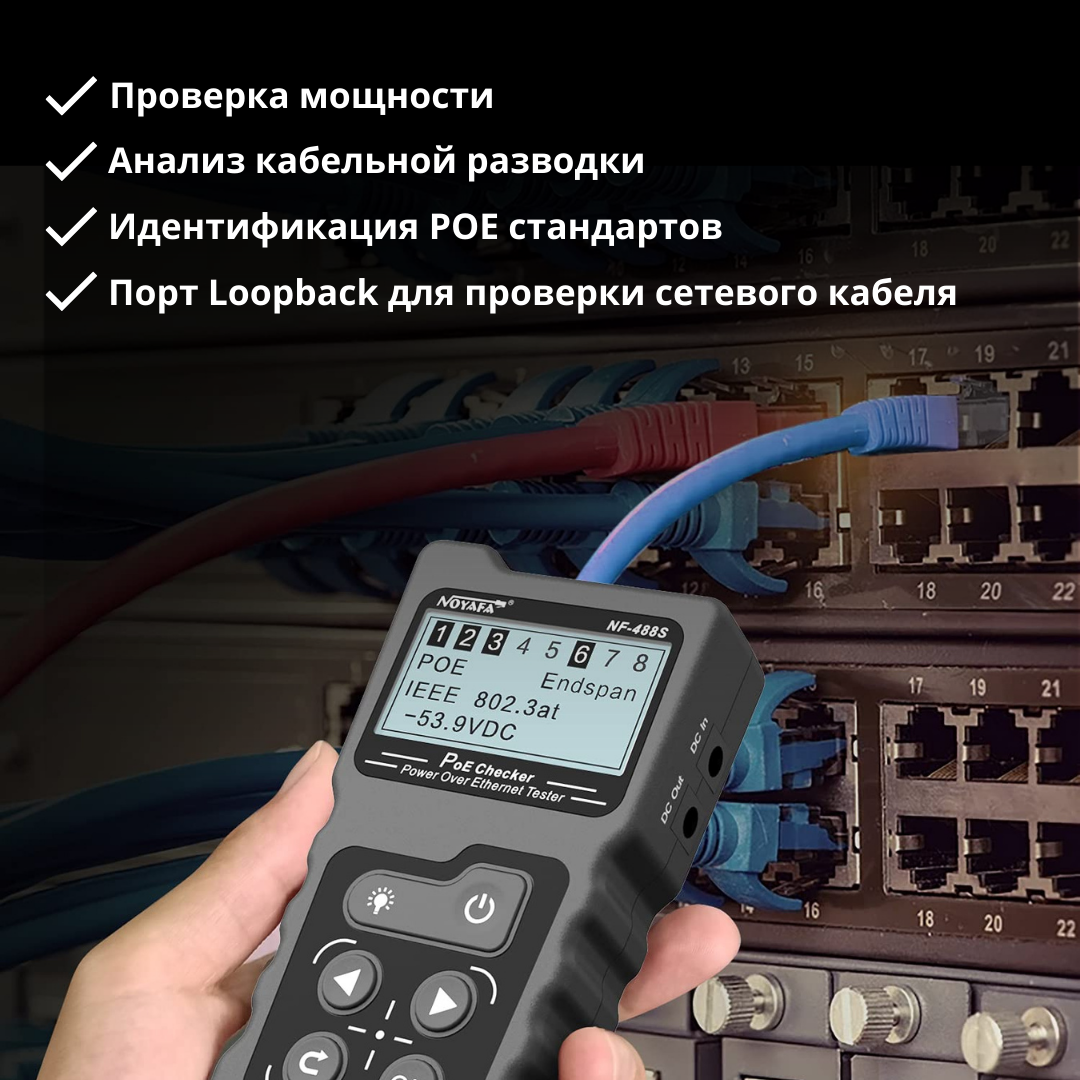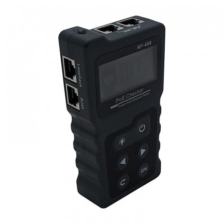 | Дополнительная информация | Определение типа PoE-питания; оценка энергопотребления; проверка качества Ethernet-кабеля; оценка мощности, силы тока и напряжения; Loopback - проверка отклика коммутатора на сигнал, посылаемый тестером. |