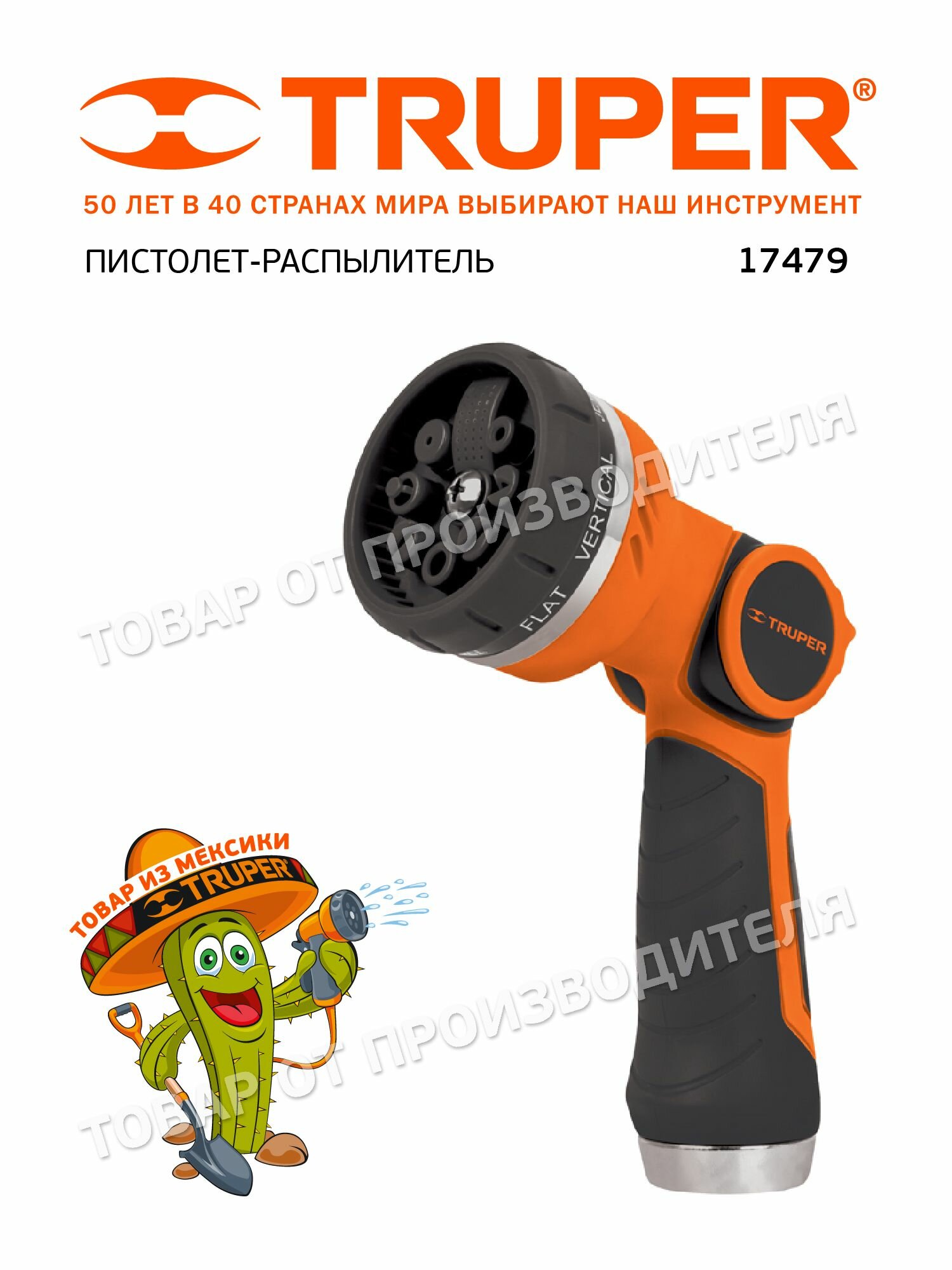 Пистолет для полива TRUPER / Трапер из термопластичной резины, черно-оранжевый, 8 режимов распыления, 20х7х3см / сад и огород интересное: