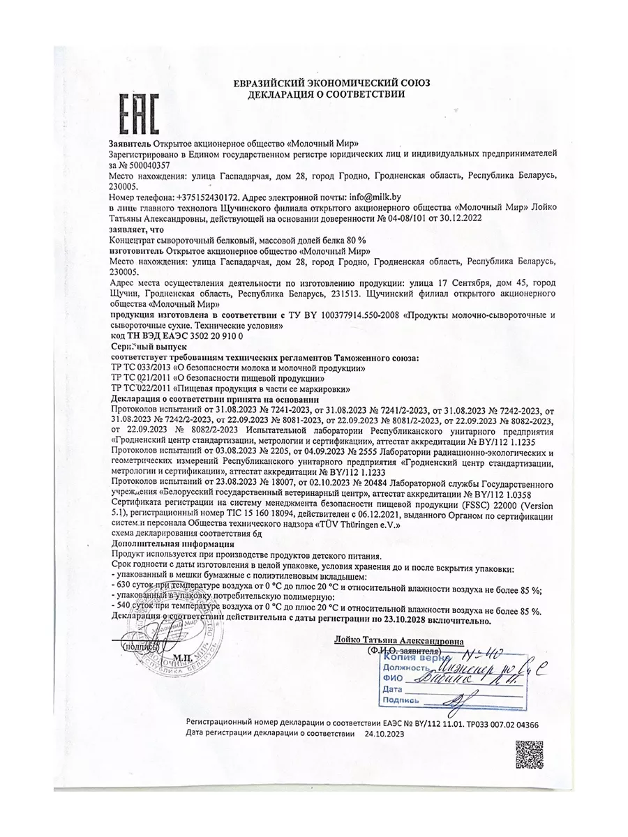 | Дополнительная информация | Состав: сыворотка молочная подсырная. Аминокислотный состав, мг. для 100г сухого продукта. Незаменимые аминокислоты: Изолейцин 6818,22/Лейцин 6320,94/Лизин 8872,05/Метионин 688,64/Цистеин 1393,90/Фенилаланин 2586,50/Тирозин 2451,25/Треонин 4488,28/Валин 3911,90 Заменимые аминокислоты: Аланин 4363,48/Аргинин 3968,68/Аспаргиновая кислота 7218,66/Гистидин 2997,45 Глицин 2125,24/Глютаминовая кислота 13521,14/Пролин 4732,62/Серин 3367,14 Примечание - Фактическое значение аминокислот могут отличаться от расчётных в пределах ±22% Энергетическая ценность (калорийность), кДж/ккал: 1600/380 Пищевая ценность 100г продукта: белки 80г, жиры 5,5г, углеводы 2,0г. |