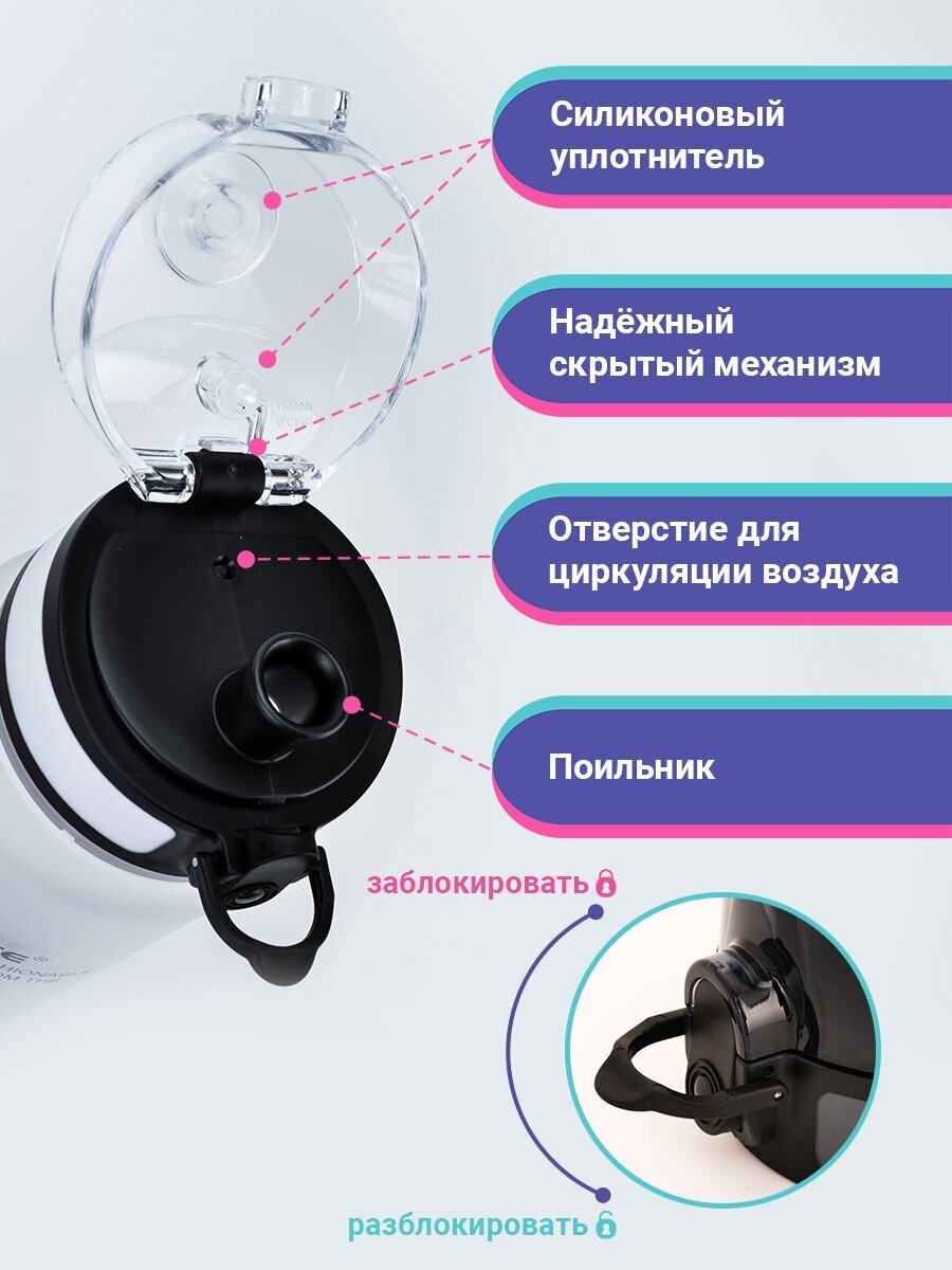 Нет постороннего запаха. Блокиратор на крышке и силиконовые вставки внутри защищают от протекания при любом положении бутылки. Внутри пластиковая сеточка, позволяющая фильтровать крупные частицы (например чаинки или ягоды и тп). |
