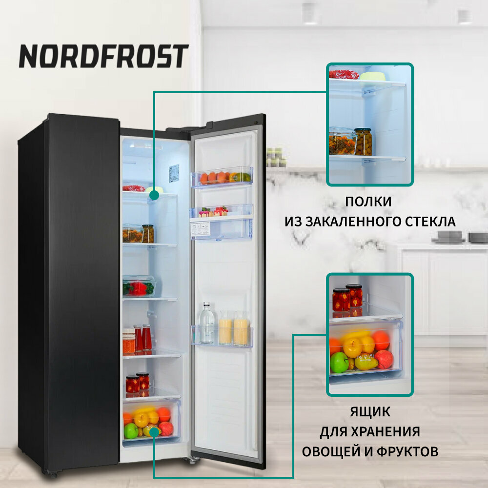 Холодильник NORDFROST RFS 484D NFH, INVERTER, Total No Frost; Side-by-side, 472 л, Класс A++, Диспенсер на двери, Ледогенератор механический поворотный,LED освещение, Электронный дисплей, Режимы «Суперзаморозка» и «Суперохлаждение»