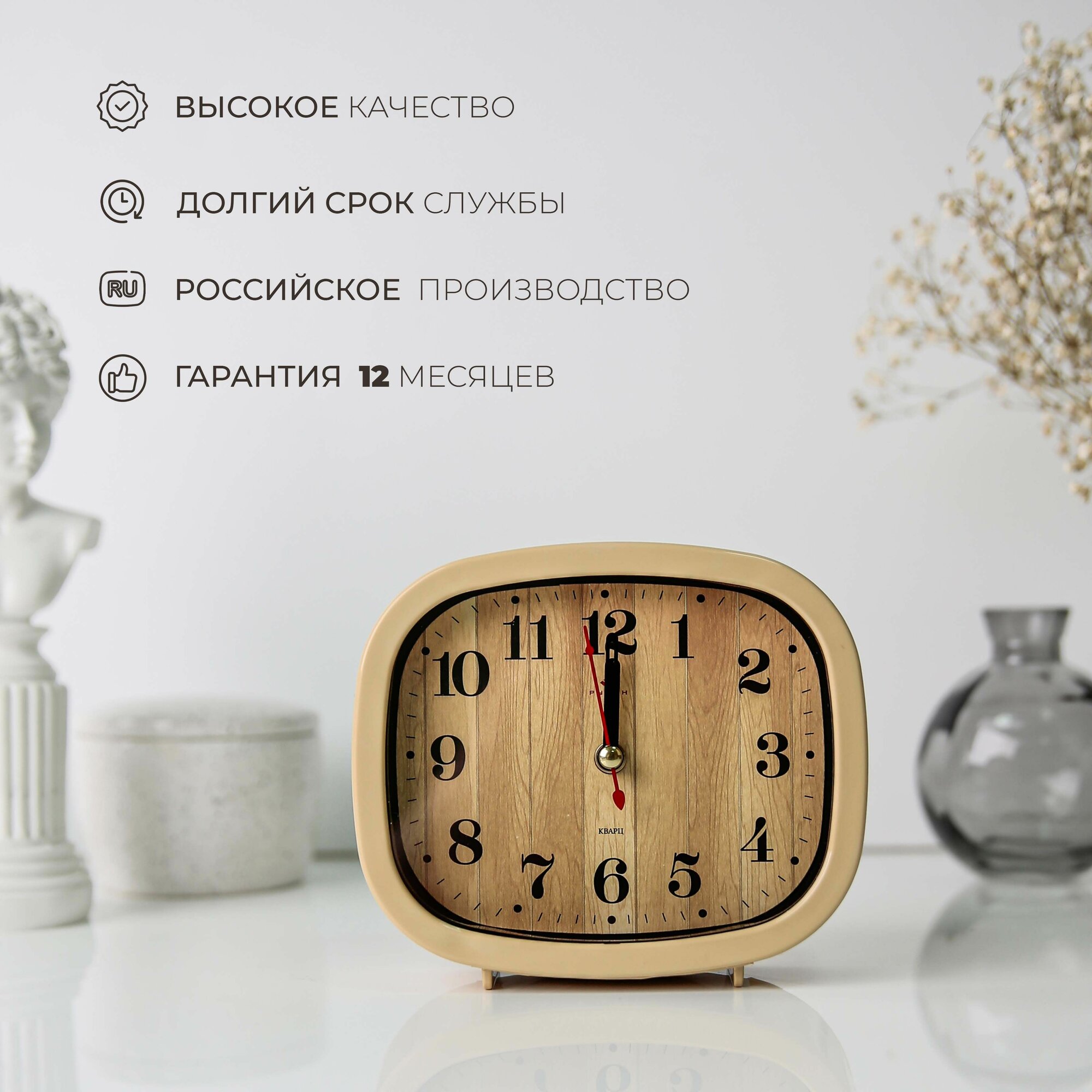 Часы-будильник кварцевые в современном стиле в форме круга Рубин Классика В5-001 с большими арабским цифрами для украшения интерьера гостиной, спальни, кухни или офиса