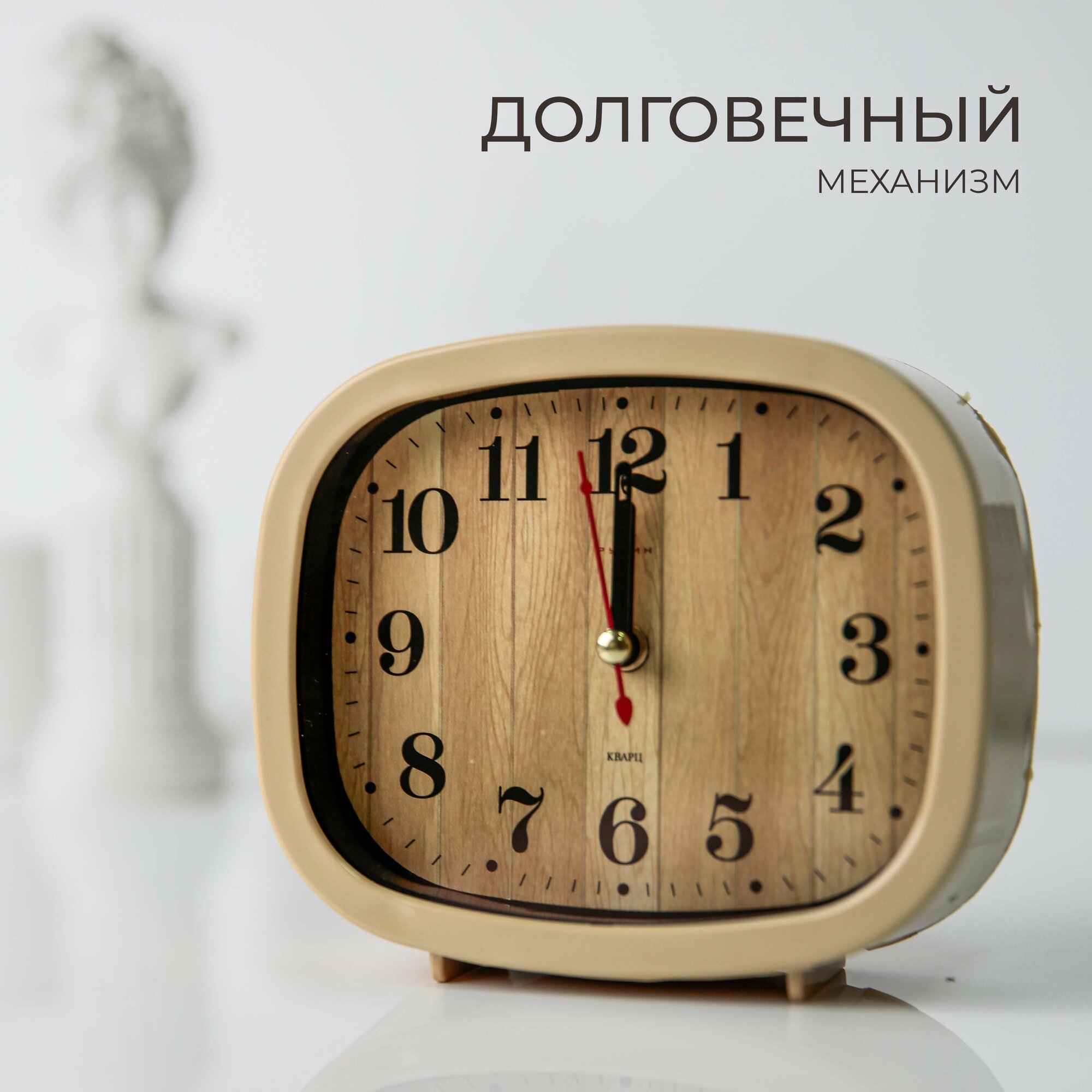 Кварцевый будильник "Рубин", настольный, арабские цифры, пластик, белый/коричневый