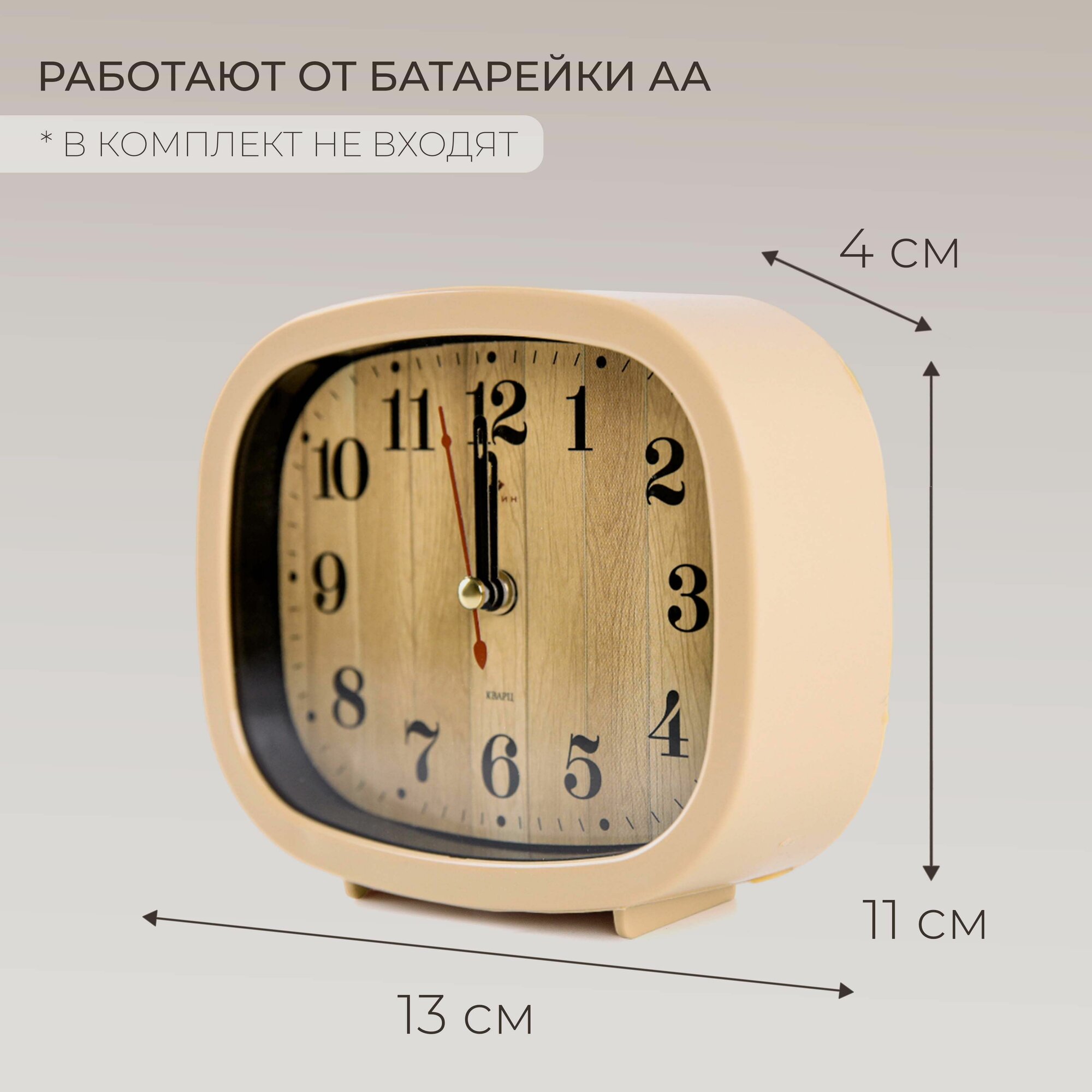 Будильник настольный Рубин Классика для спальни с арабскими цифрами, от пальчиковой батарейки АА, ширина 12.5 см высота 10.5 см