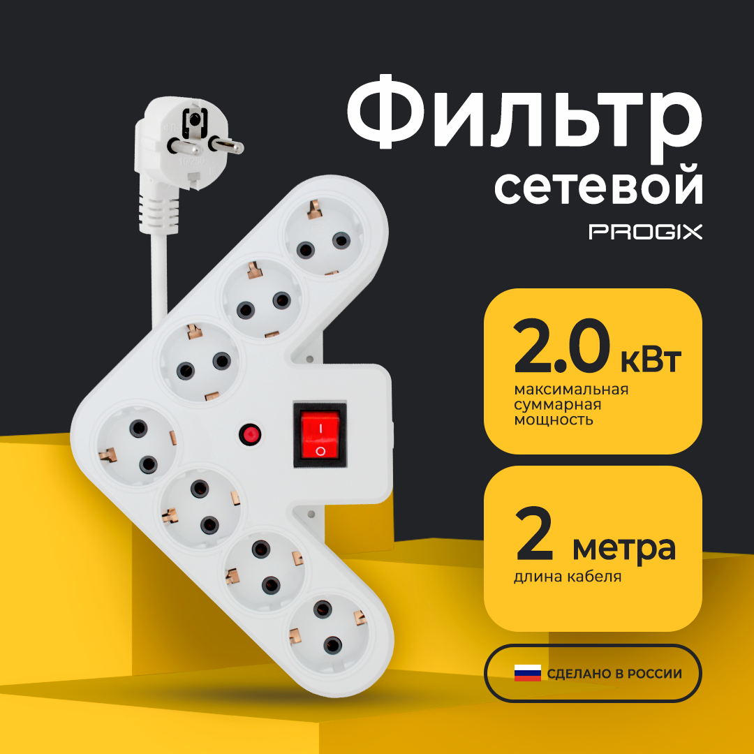 Удлинитель сетевой фильтр Progix 7 гнезд / розеток, 3 метра, с заземлением, с выключателем, белый, 10 А, 2000 Вт, без USB, 3 м, переноска