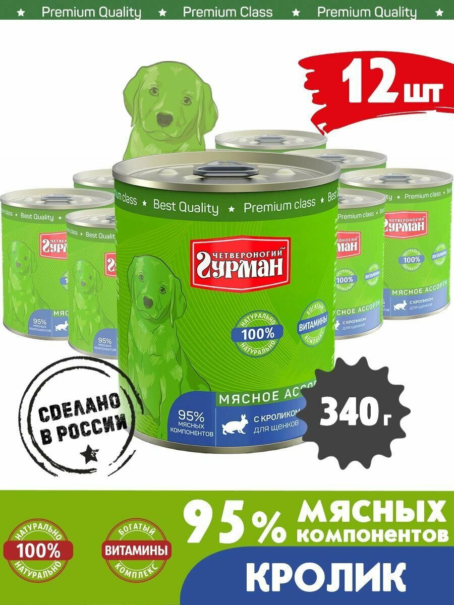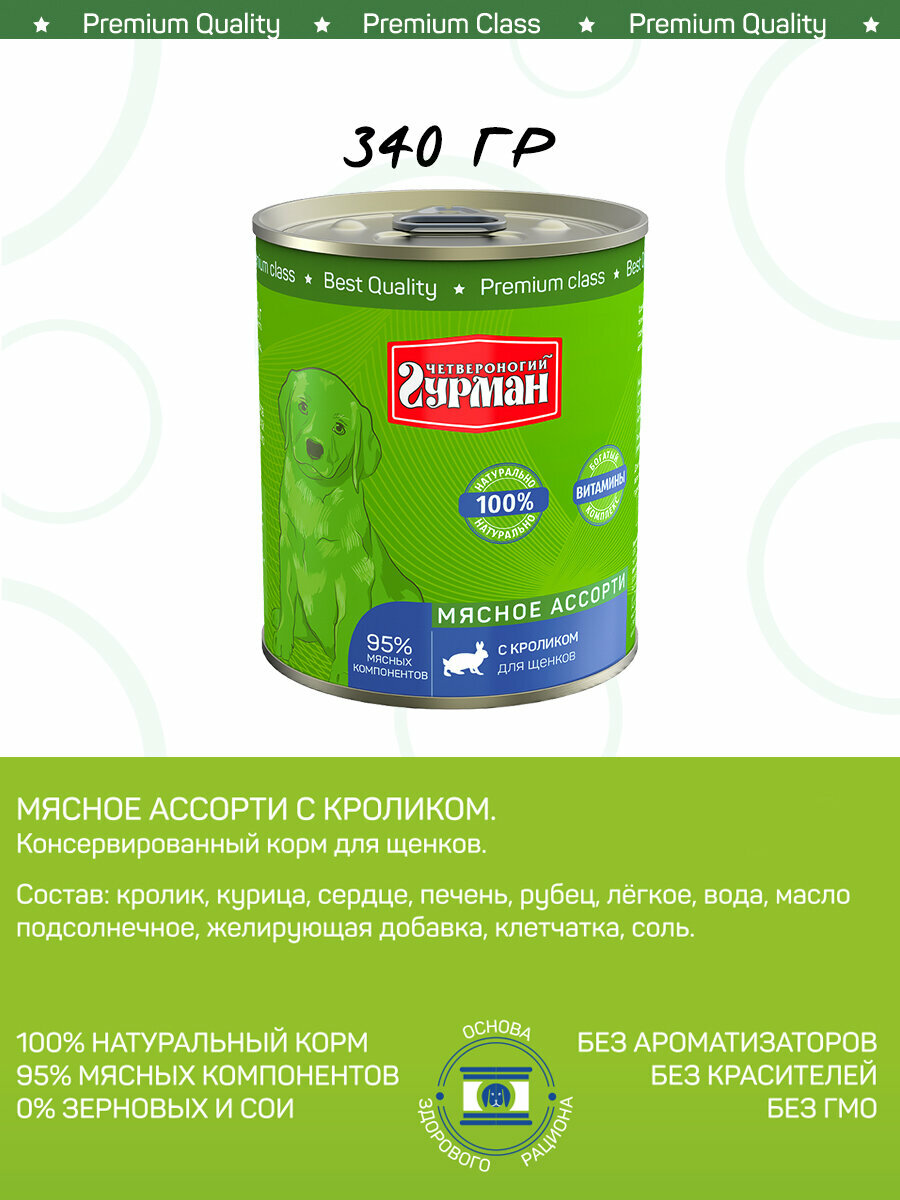 Корм консервированный для щенков Четвероногий Гурман "Мясное ассорти с кроликом", 340 г х 12 шт
