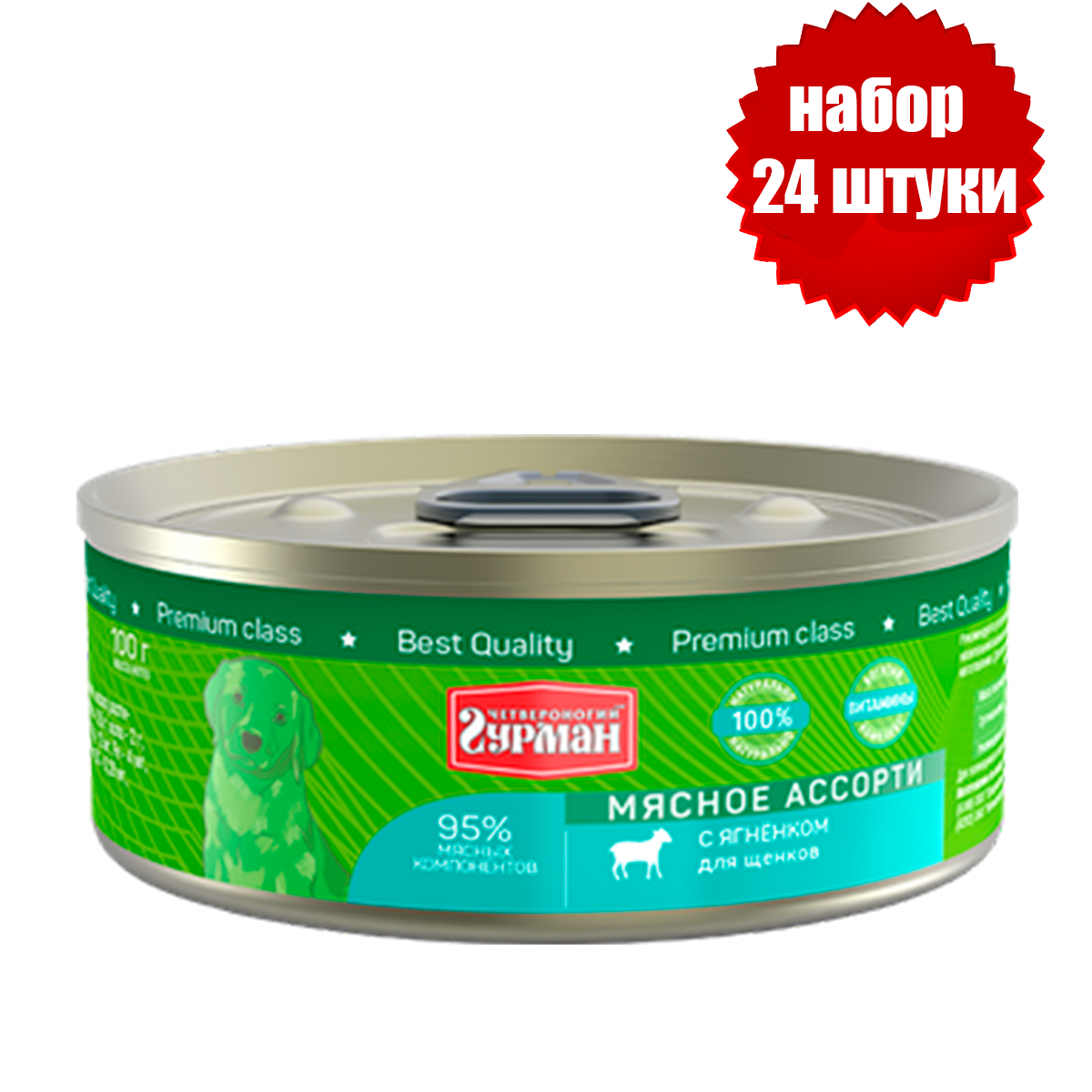 Четвероногий Гурман для щенков Мясное ассорти с Ягненком,консервы 100г (24 банки)