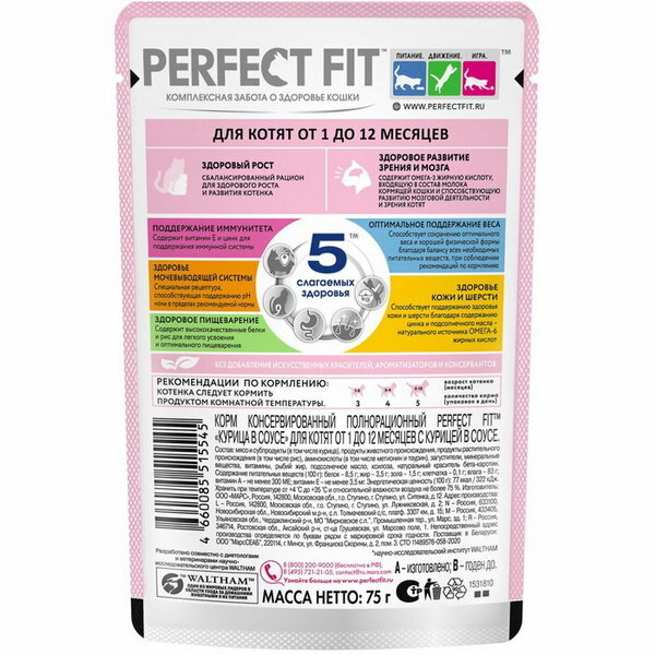| Дозировка | Корм предназначен для котят до 12 месяцев: для котят до 2 месяцев: 2 пакетика в день; для котят от 3 – 4 месяцев: 3-4 пакетика в день; для котят от 5 – 12 месяцев: 4-5 пакетика в день. |