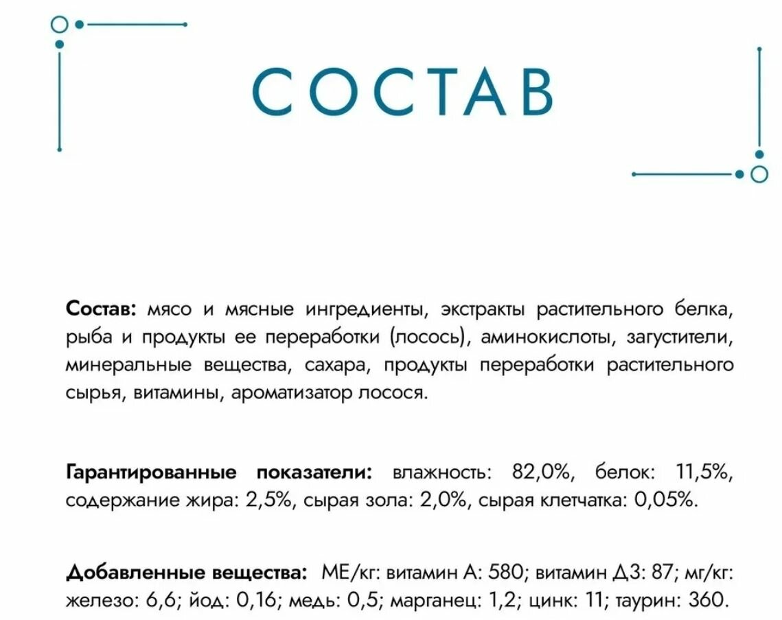 | Витамины | Д3: 99 МЕ/кг; таурин: 410 мг/кг |