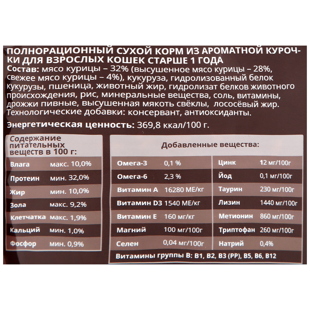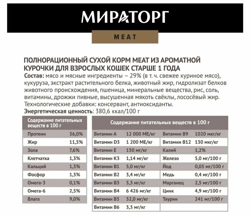 | Минеральные вещества | Влага – макс. 10,0%, Протеин – мин. 20,0%, Жир – мин. 11,0%, Зола – макс. 9,2%, Клетчатка – макс. 3,3%, Кальций – мин. 0,9%, Фосфор – мин. 0,8%(%) Омега-3 0,2, Омега-6 2,1; (МЕ/кг): витамин А 26 450, витамин D3 1 480, витамин Е 220 мг/кг; витамины группы B: В1, В2, В3 (РР), В5, В6, В12. (мг/100г): магний 110, цинк 11, медь 0,9. |