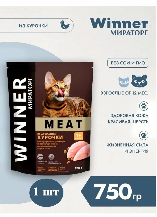 Купить WINNER MEAT Корм сухой полнорационный для взрослых кошек старше 1 года из ароматной курочки 750г