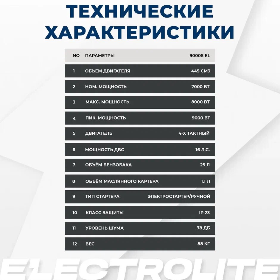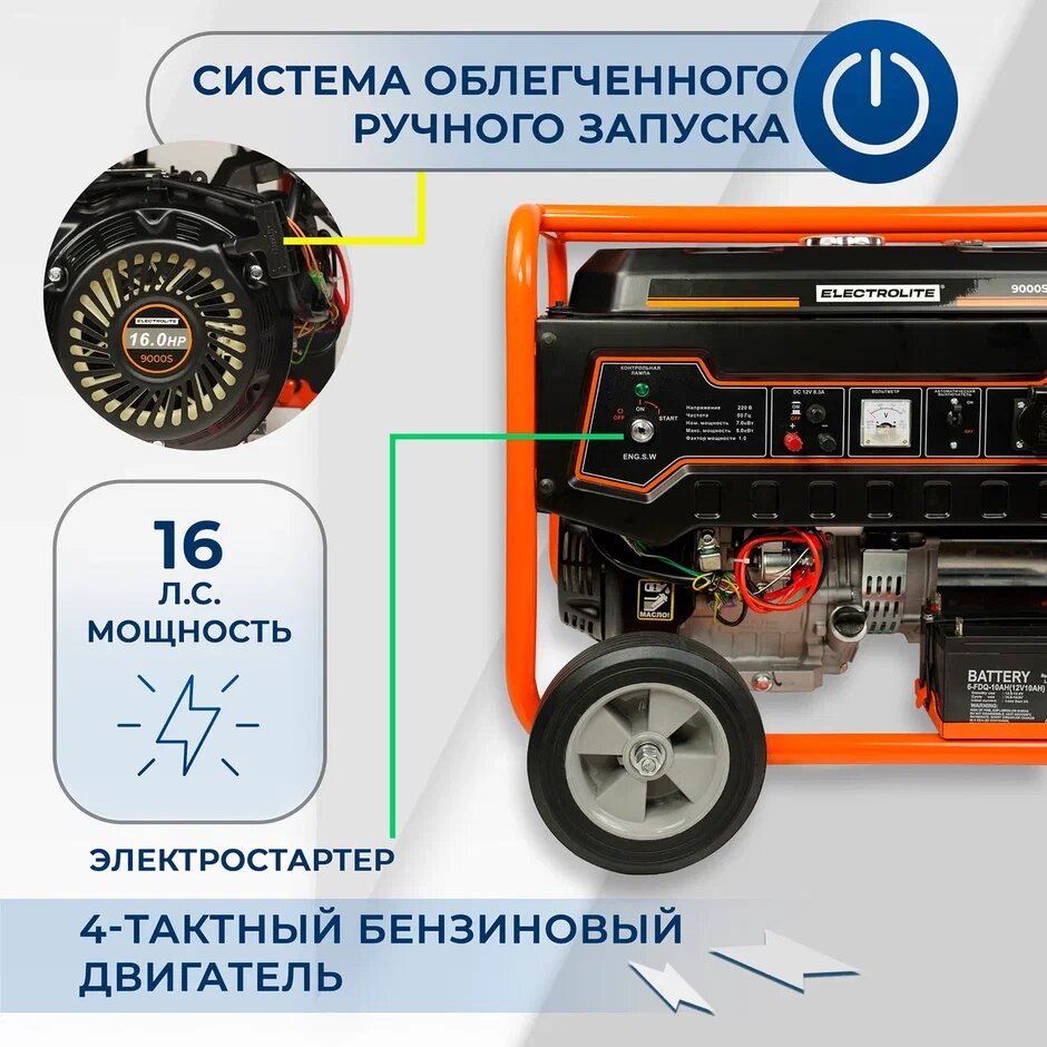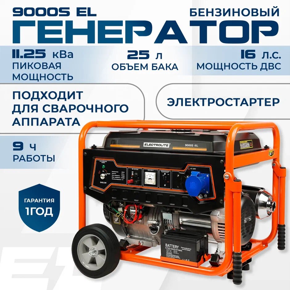 Генератор бензиновый Электрический Electrolite 9000S ( 11.25 кВа пиковая нагрузка , 220 В / 12 В, 7 / 8 кВт, 50 Гц, 16 л.с, электростартер + АКБ )