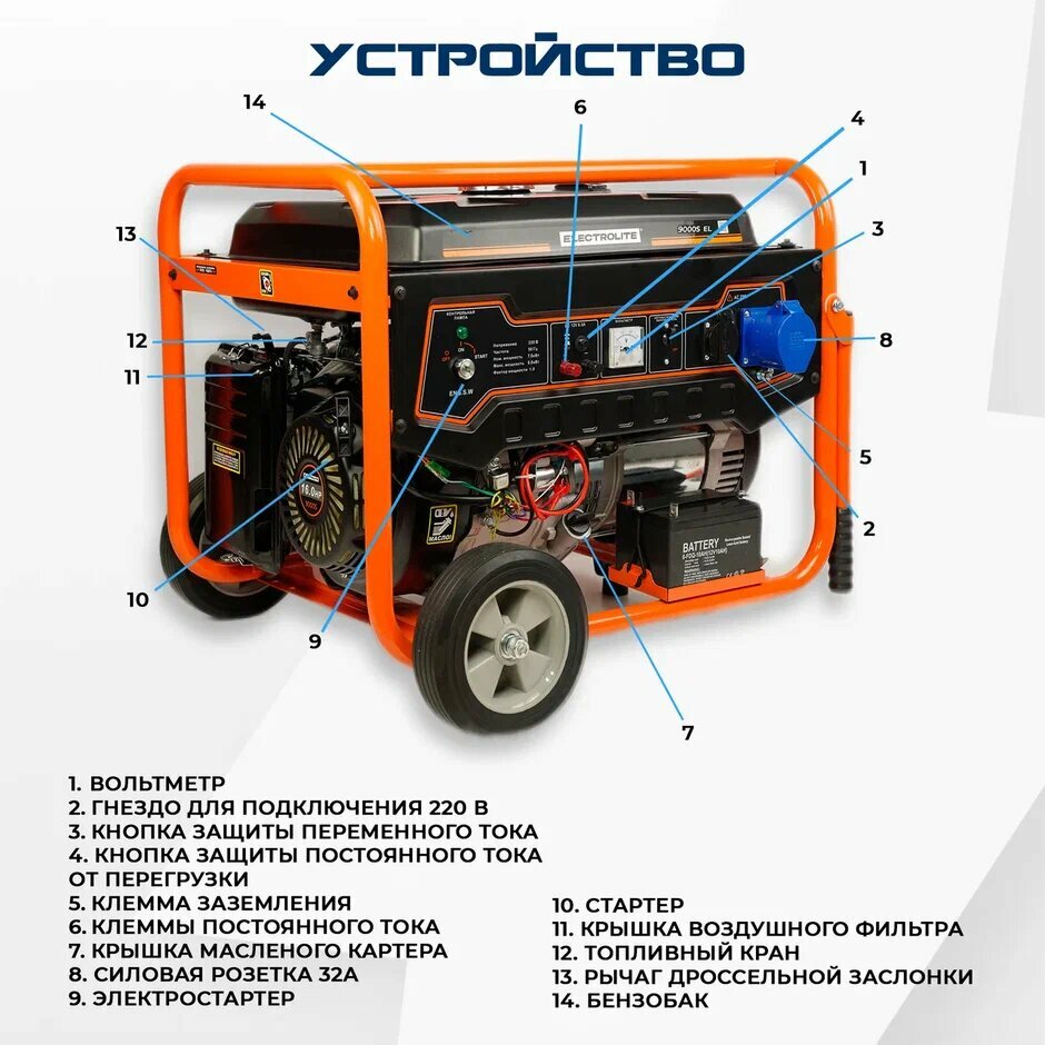 СохранитьГенератор бензиновый / электростанция / бензогенератор Electrolite 9000S-EL медная обмотка ( 11.25 кВа пиковая нагрузка , 220 В / 12 В, 7 / 8 кВт, 50 Гц, 16 л.с, электростартер + АКБ ) интересное: