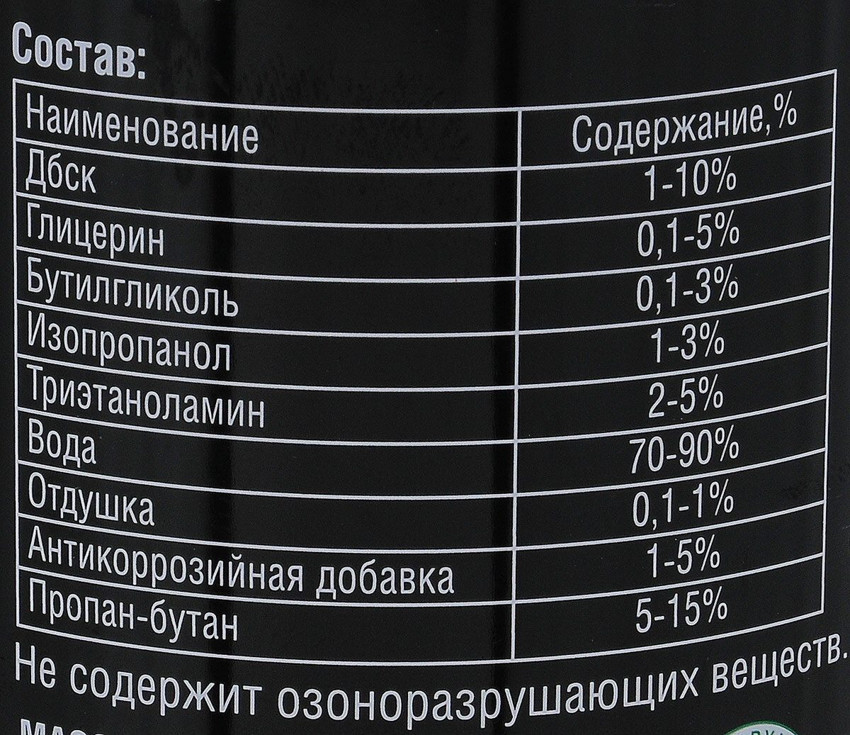 | Способ применения | интенсивно встряхните баллон перед использованием; нанесите средство на поверхность; подождите несколько секунд; протрите насухо и отполируйте поверхность мягкой салфеткой |