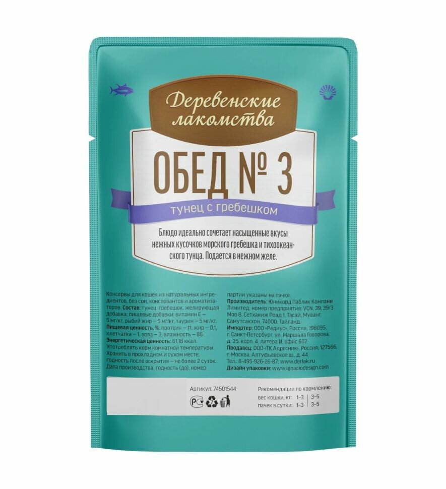 Корм влажный Деревенские лакомства Обед №3 пауч д/кошек Тунец с гребешком 50г