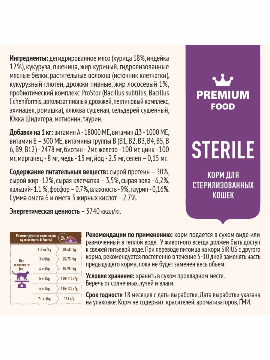SIRIUS/Полнорационный сухой PREMIUM корм для стерилизованных кошек, Индейка и курица, 0.4 кг
