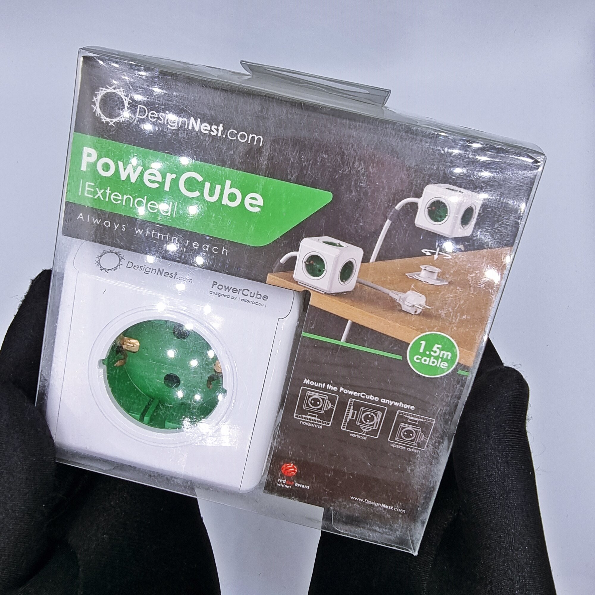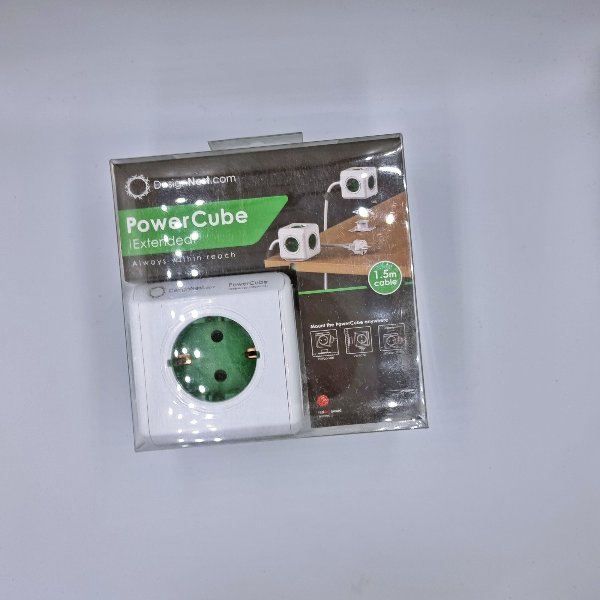 Фильтр сетевой (удлинитель) Allocacoc DesignNest PowerCube Extended GREEN 1300GN/DEEXPC, 5 розеток, провод 1,5 метра, без USB, крепление в комплекте