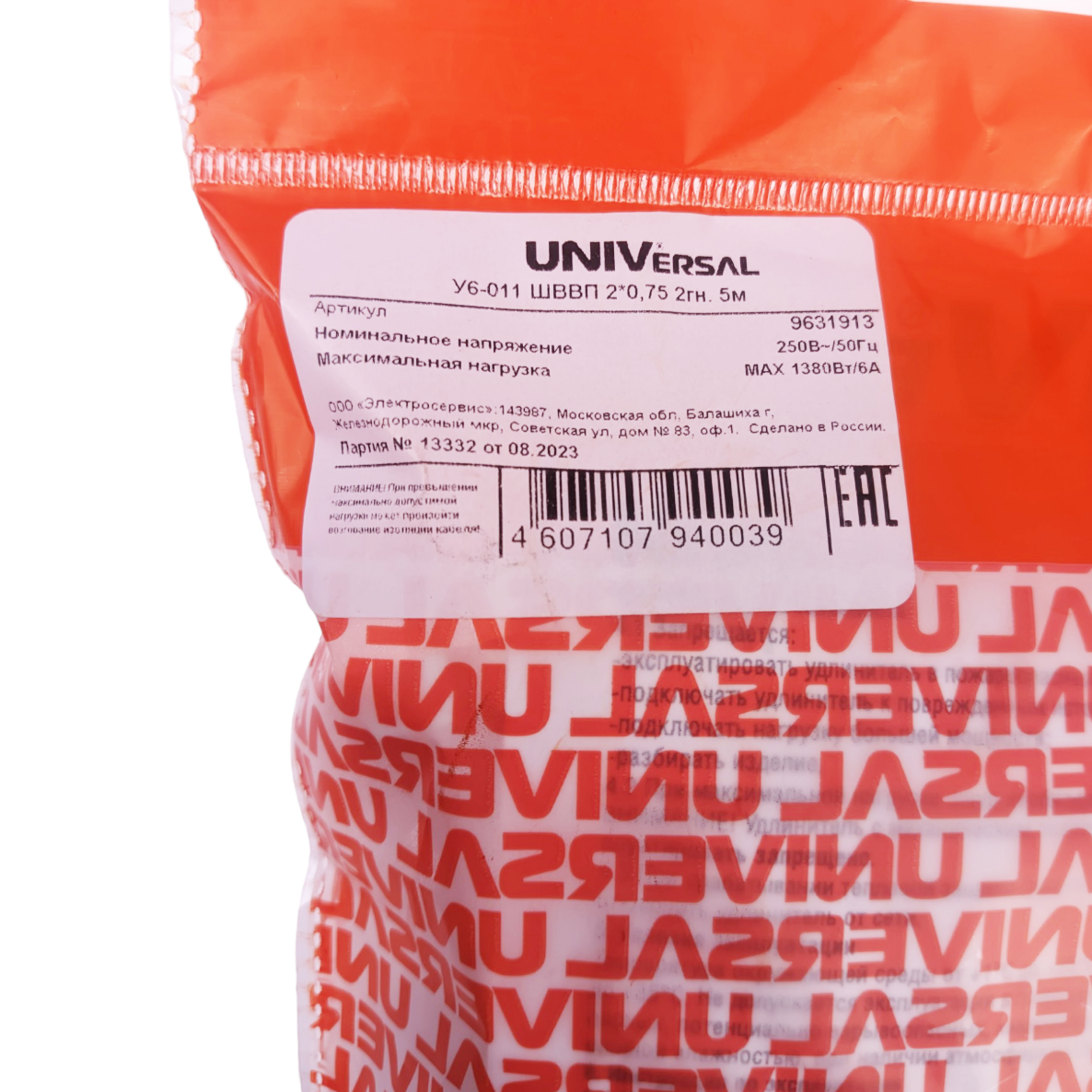 Удлинитель 2х5м без заземл. 6А IP20 У6-011 ШВВП 2х0.75, UNIVERSAL 9631913 (1 шт.)