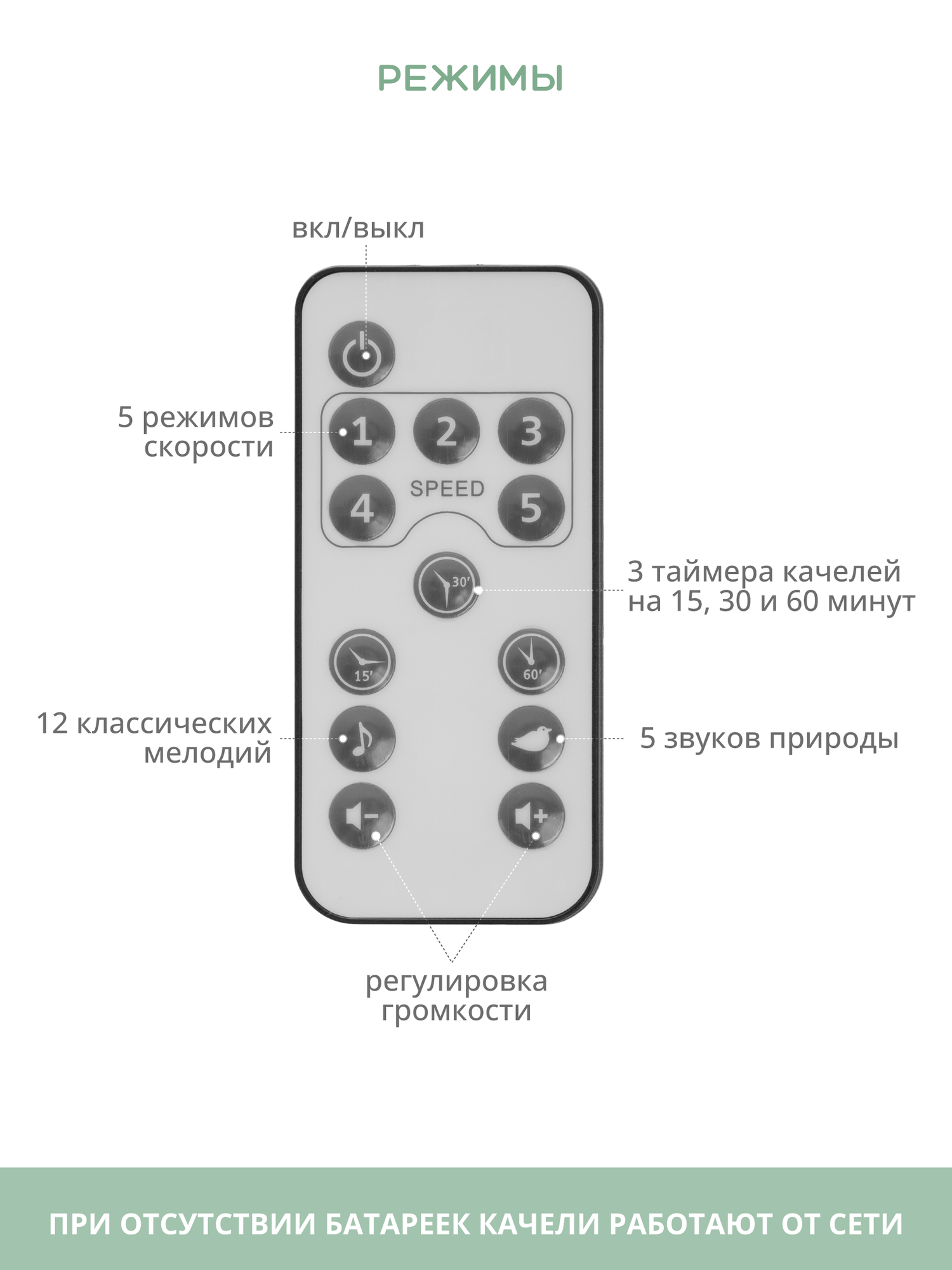| Особенности | качели-трансформер / пульт ДУ / работа от батареек / регулировка громкости / таймер укачивания |