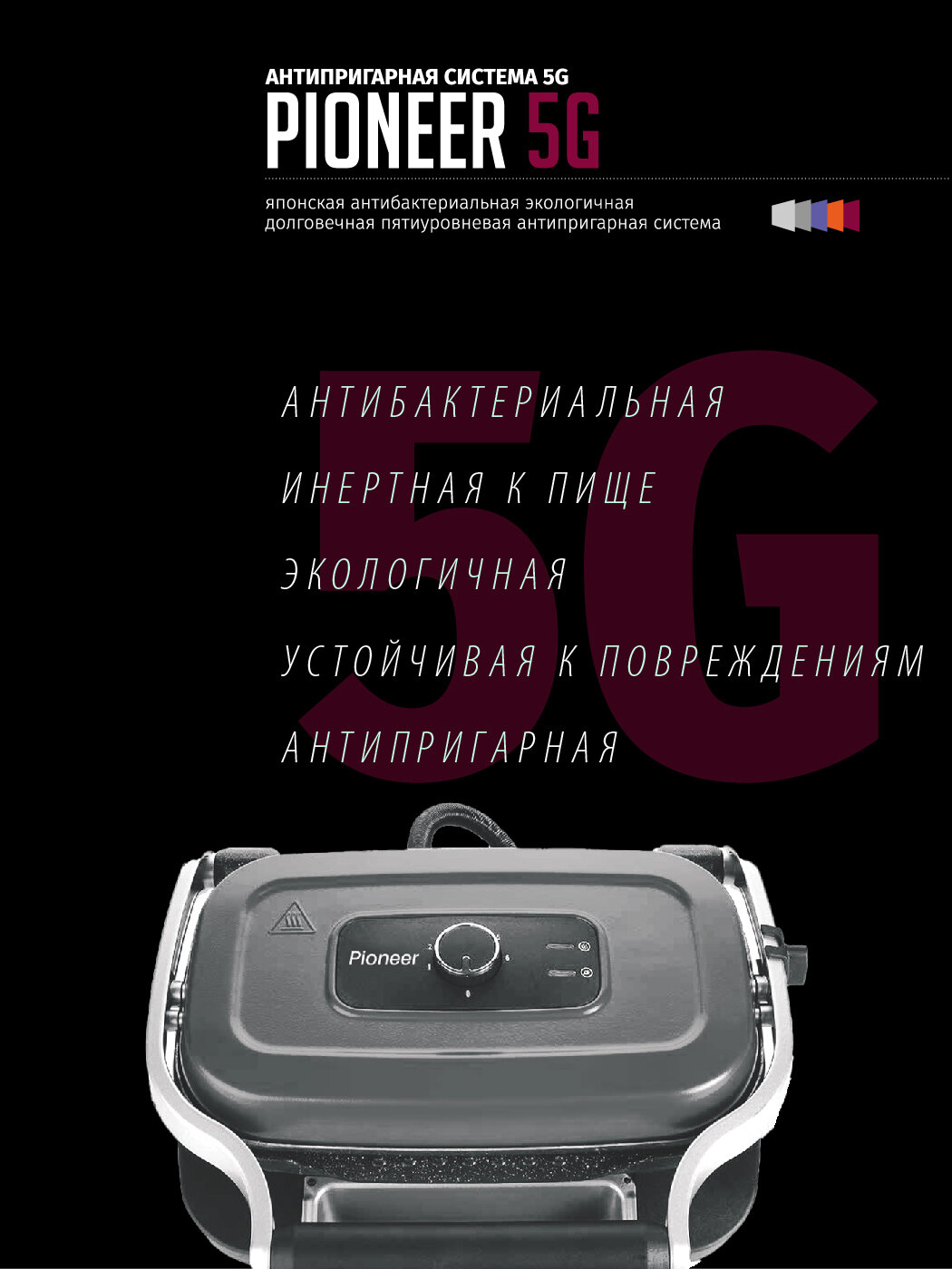 Гриль электрический Pioneer с утолщенными антипригарными панелями, 2 рабочих положения: гриль-пресс и открытие на 95 градусов, 6 режимов, 1400 Вт