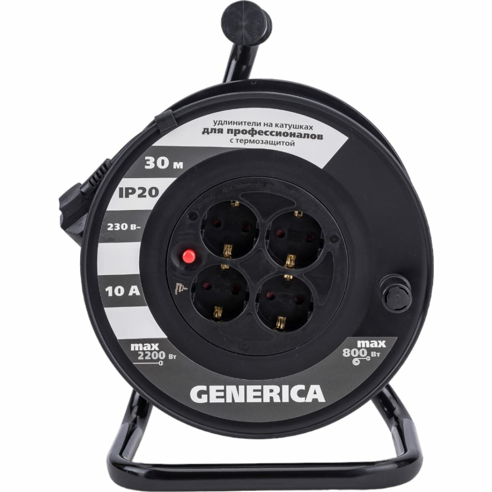 Удлинитель силовой на катушке Generica 4х30м 2P+PE 10А УК30 с термозащ. 3х1.0кв. мм, WKP10-10-04-30-G