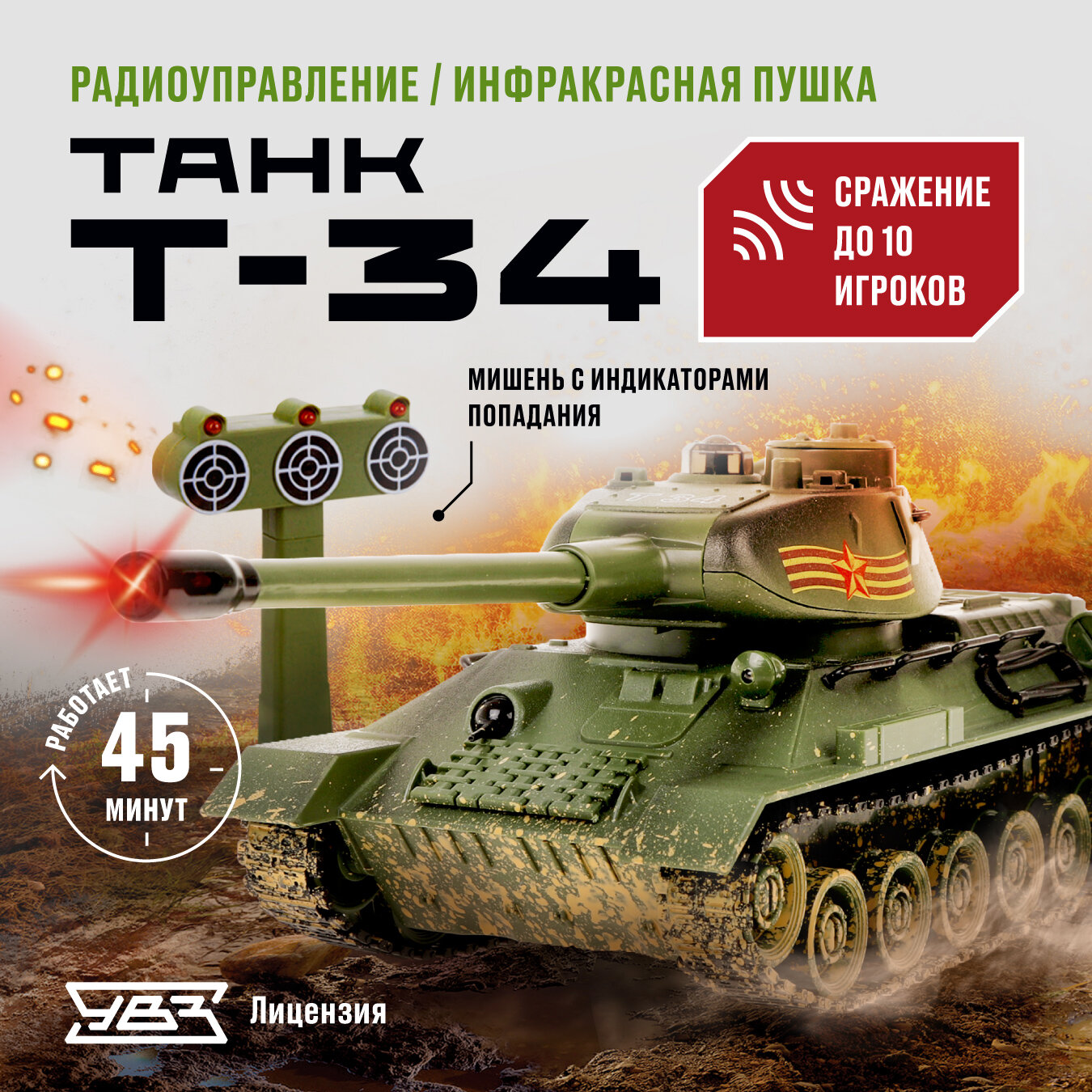 Танк р/у 1:24 Т-34 (СССР), аккум. Тренировочная мишень с индикаторами жизни, мина со свет., звук.