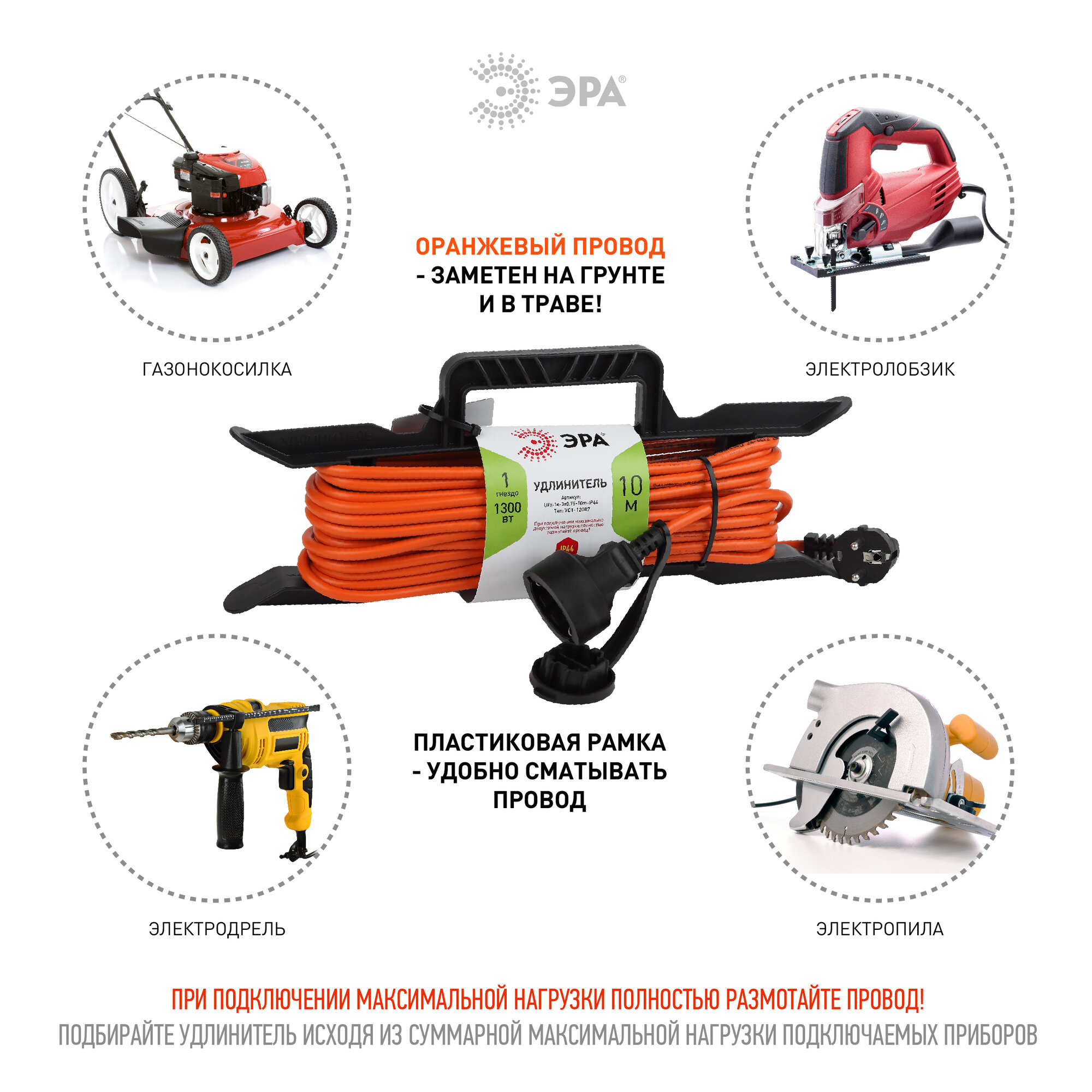 Силовой удлинитель ЭРА UFx-1e-3x0.75-10m-IP44 на рамке, c заземлением, 1 гнездо, 10м, ПВС, 3x0.75 Б0046825