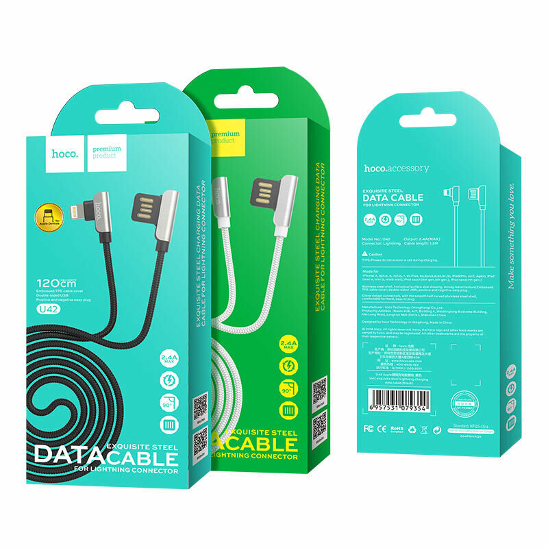 Кабель USB2.0 Am - Lightning Hoco U42 2.4A White, оба коннектора угловые, сталь, белый - 1.2 метра