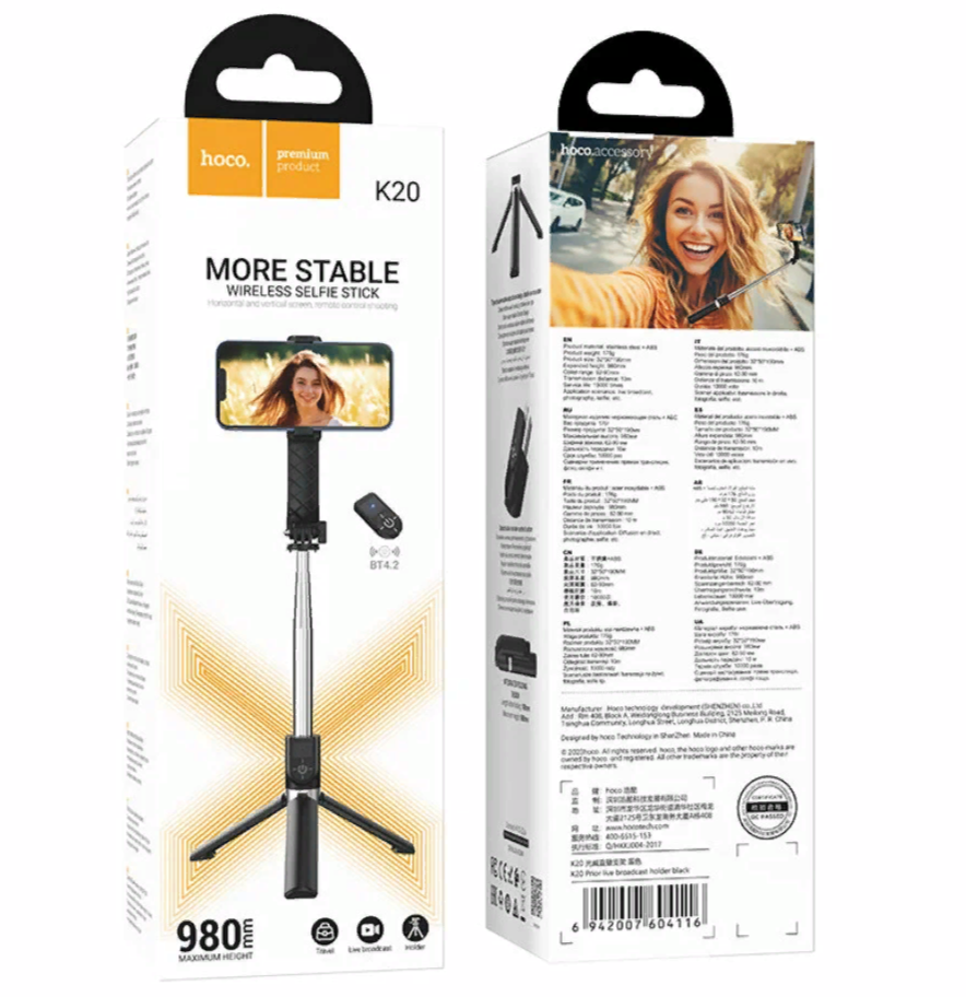 Селфи K20, HOCO, беспроводной трипод с пультом, черный