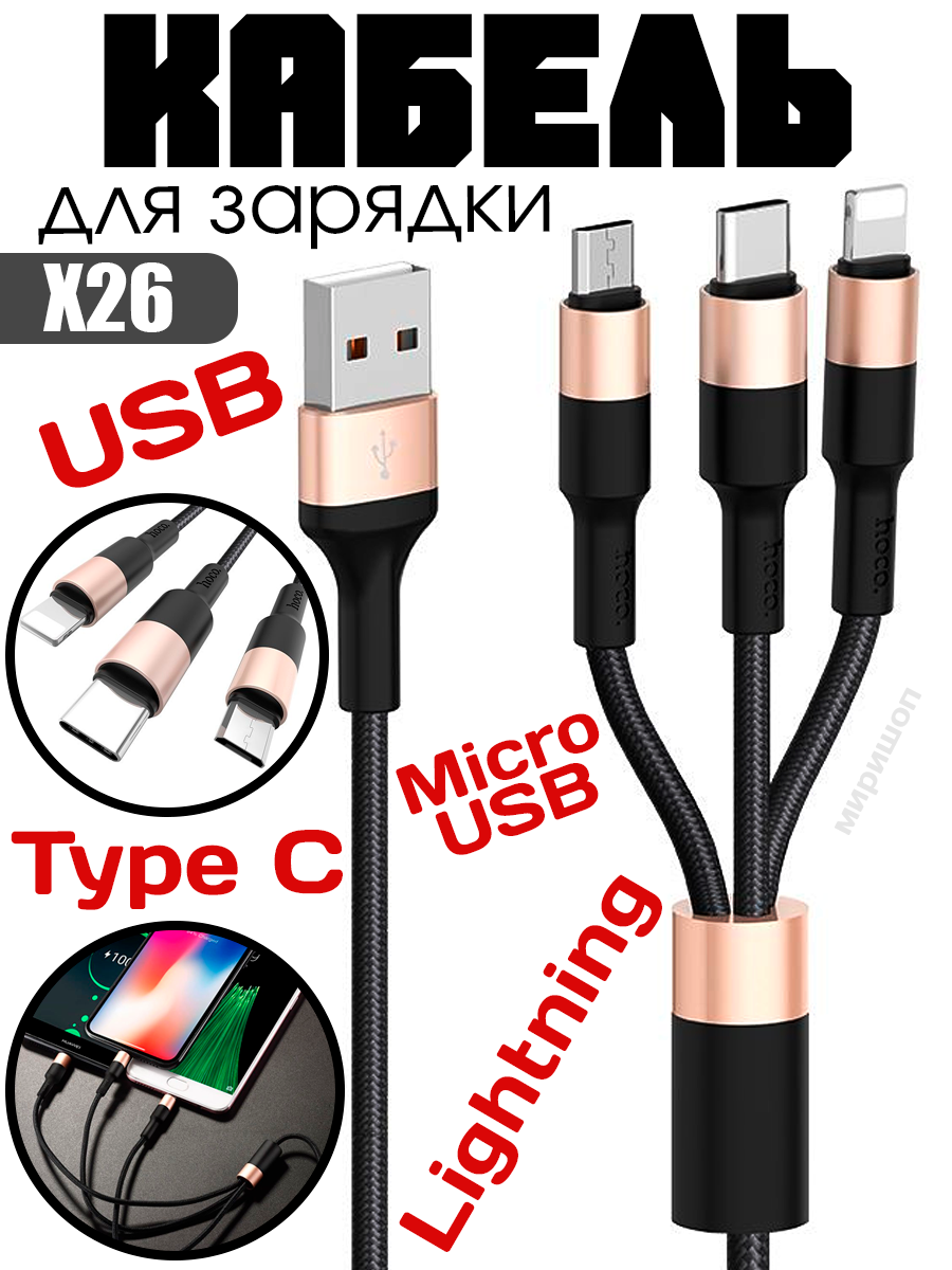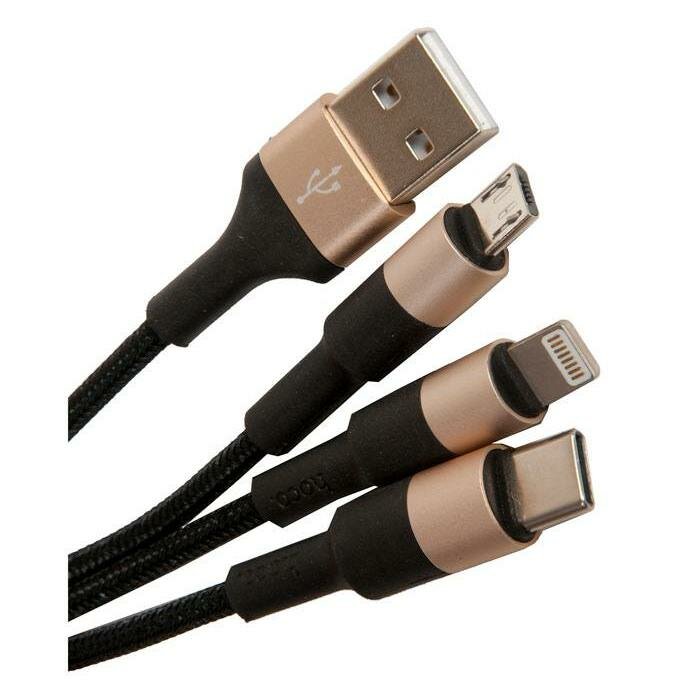 Кабель USB HOCO X26 Xpress 3 в 1 для Lightning, Micro USB, Type-C, 2.0A, 1 м, черный с золотым