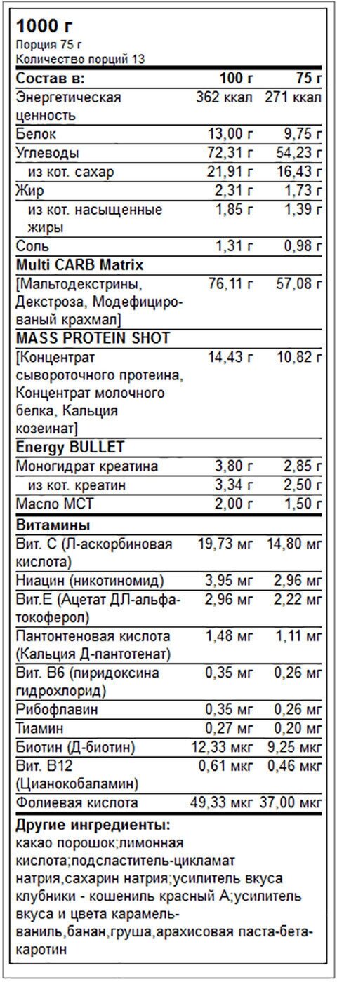 | Дополнительная информация | рекомендации по применению: Одноразовую дозу препарата – 75 г (2,5 мерки – 125 мл) растворить в 250 мл воды или молока при помощи шейкера или миксера. В зависимости от необходимого количества следует принимать 3–4 порции в день. В дни тренировок: I порция – за 1,5 часа до тренировки, II порция – не позднее, чем 0,5 часа после тренировки, остальные порции – между приемами пищи. В дни без тренировок: первая порция утром после пробуждения, остальные порции – между приемами пищи. |