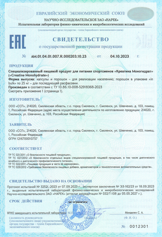 | Дополнительная информация | размер порции: 5.5 шт.; энергетическая ценность на 100 г: 0; рекомендации по применению: Продолжительность приема: не более 4 недель, повторный прием через 2 недели.; состав: Креатин моногидрат |