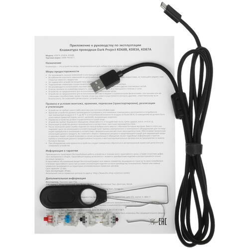 | Комплектация | Дополнительно: документация, дополнительные переключатели, кабель USB, пуллер для кейкапов, пуллер для переключателей |