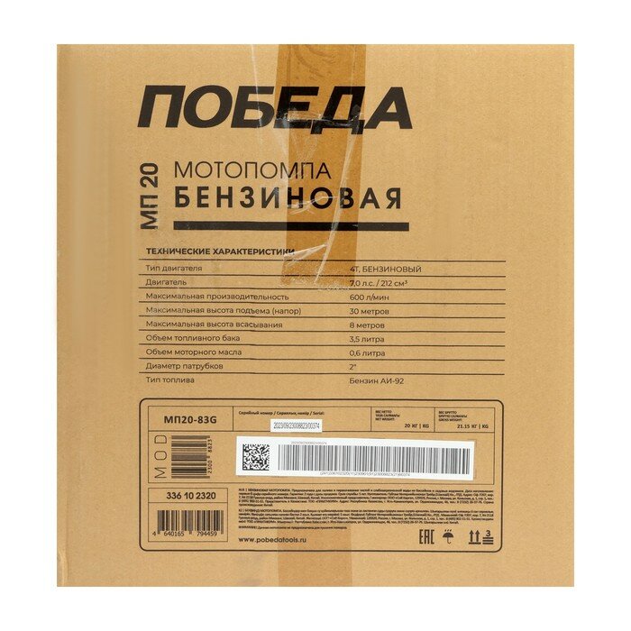 Мотопомпа бензиновая победа МП 20, 7лс, 5150Вт, 600л мин